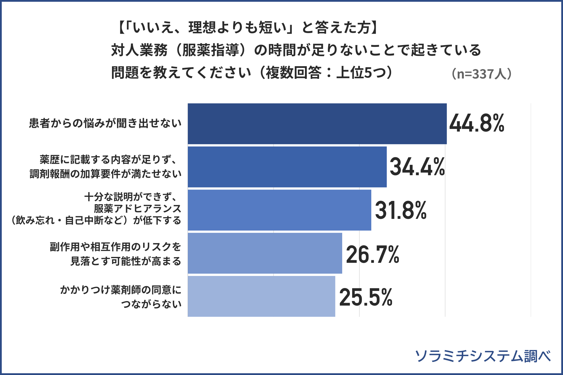 服薬指導の時間が足りないことで起きている問題(複数回答)としては、「患者からの悩みが聞き出せない」44.8%、「薬歴に記載する内容が足りず、調剤報酬の加算要件が満たせない」34.4%、「十分な説明ができず、服薬アドヒアランス(飲み忘れ・自己中断など)が低下する」31.8%が上位に挙がりました。これらの結果から、時間的な制約が患者とのコミュニケーションや薬学的管理の質にも影響し得ることがうかがえます。服薬指導は患者が安全に治療を継続するための重要なプロセスであり、必ずしも長い時間が必要とは言えませんが、現場では的確な服薬指導を行うための十分な時間を確保できていない人もいるようです。