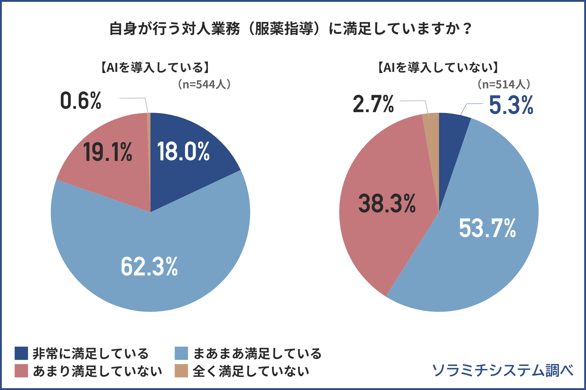 そのうえで、薬局業務においてAIを活用することで負担が軽減され、満足度にどのような差が出ているのかを確認するため、AI導入有無と満足度の関連を比較しました。服薬指導に「非常に満足している」「まあまあ満足している」を合わせた割合は、AIを「導入している」と回答した人(51.4%)では80.3%、「導入していない」と回答した人(48.6%)では59.0%と、導入している人が20ポイント以上高い満足度を示しました。