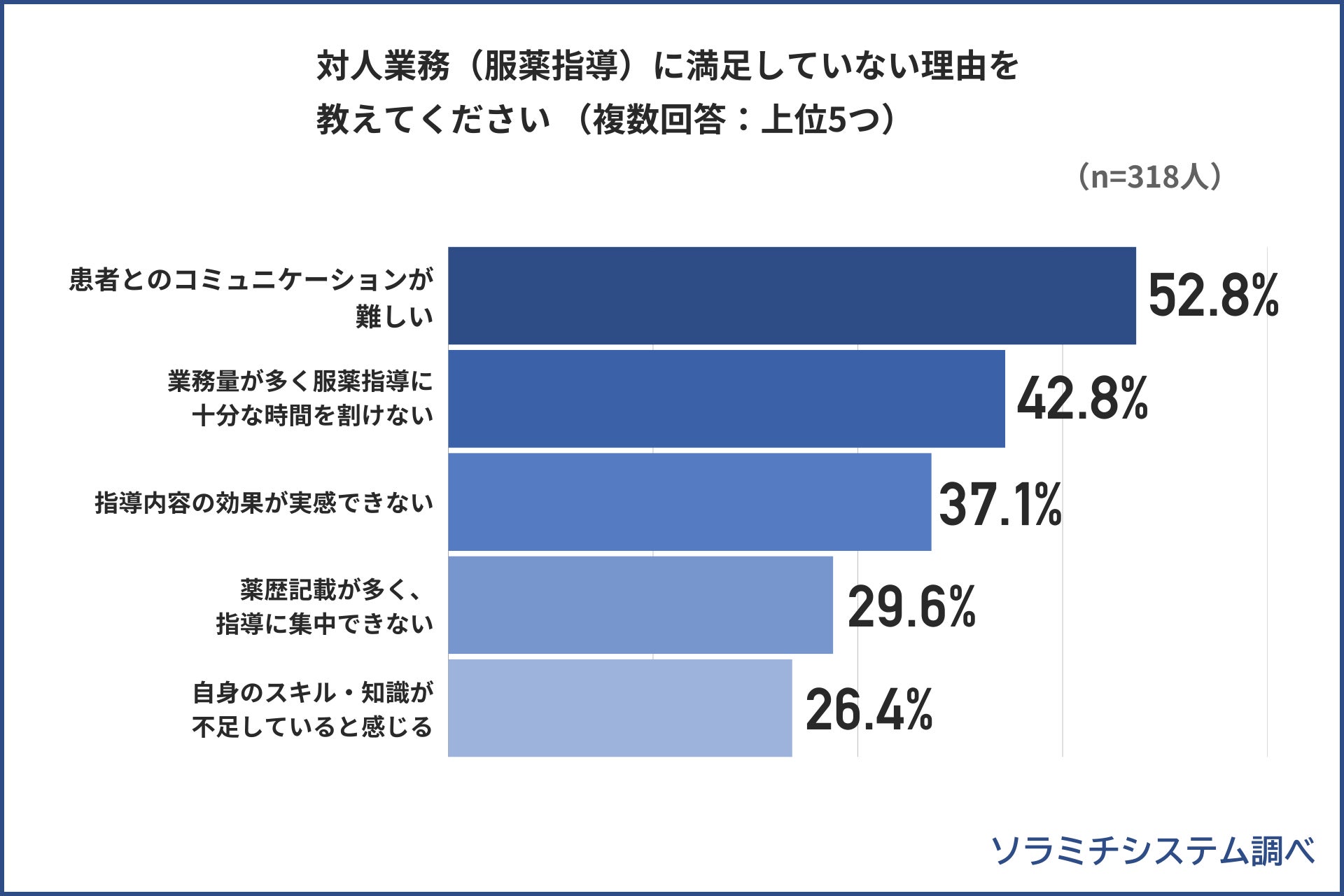 満足していない理由(複数回答)としては、「患者とのコミュニケーションが難しい」52.8%が最も多く、「業務量が多く服薬指導に十分な時間を割けない」42.8%、「指導内容の効果が実感できない」37.1%と続きました。こうした服薬指導の満足度には、業務量やコミュニケーションの難しさなど様々な要因が影響していることが分かりました。