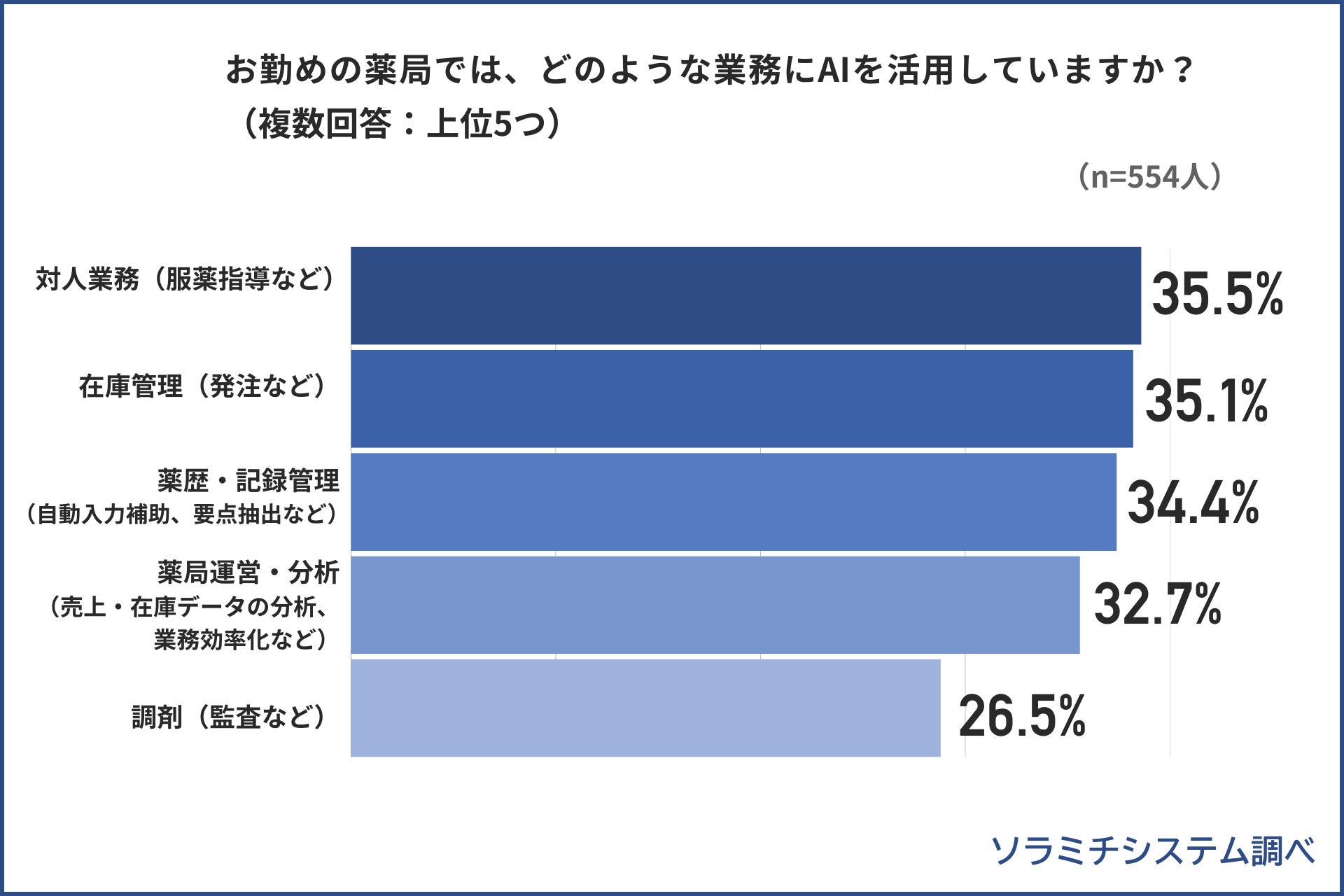 次に、AIを「導入している」と回答した人へ具体的にどのような業務にAIを活用しているのかを尋ねたところ(複数回答)、最も多かったのは「対人業務(服薬指導など)」35.5%、次いで「在庫管理(発注など)」35.1%、「薬歴・記録管理(自動入力補助、要点抽出など)」34.4%となりました。AIが、調剤や記録管理といったバックオフィス業務だけでなく、患者対応を含む対人業務にも活用され始めている実態がうかがえます。