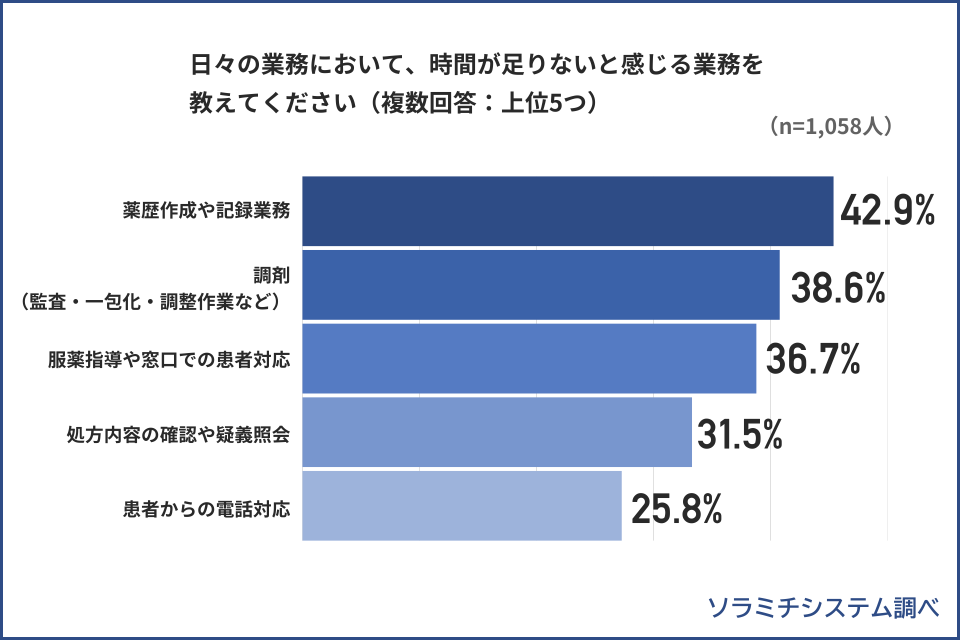 では実際に、薬剤師はどのような業務で「時間が足りない」と感じているのでしょうか。時間が足りないと感じる業務について尋ねたところ(複数回答)、最も多かったのは「薬歴作成や記録業務」42.9%、次いで「調剤(監査・一包化・調整作業など)」38.6%、「服薬指導や窓口での患者対応」36.7%となりました。多岐にわたる業務のなかでも、記録・調剤・患者対応といった日常業務の中心に位置する業務で負担感が高いことが分かりました。