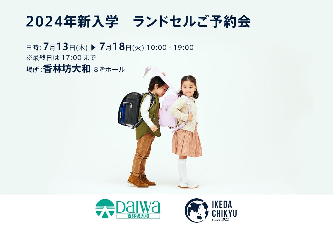 ランドセルの企画・販売を行う池田地球株式会社(本店:東京都港区:代表取締役 村尾光一)は、7/13(木)~7/18(火) の期間、香林坊大和 8階ホールにて開催される「2024年新入学 ランドセルご予約会」に参加いたします。