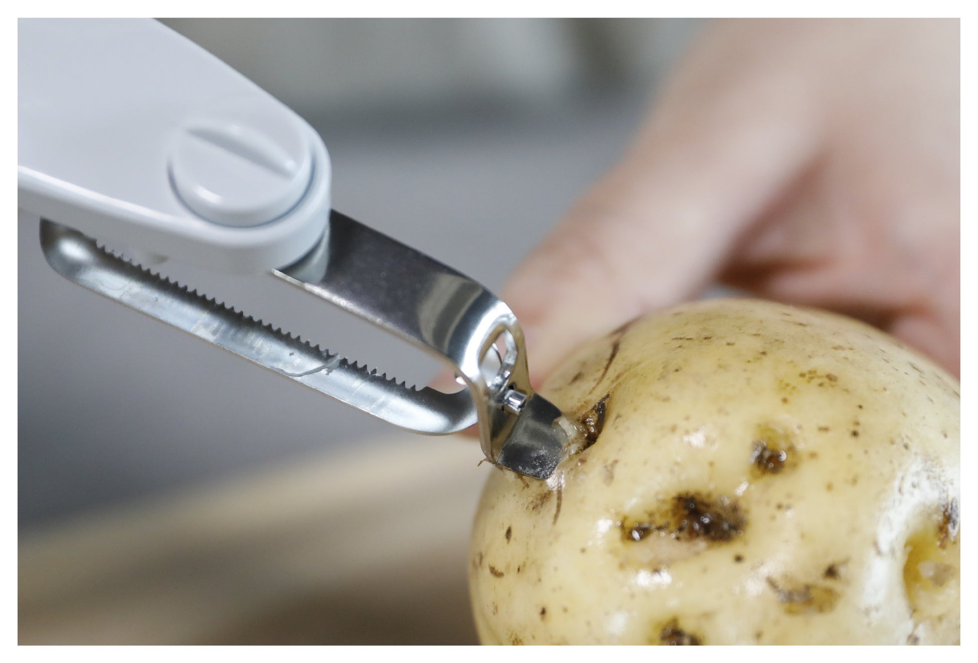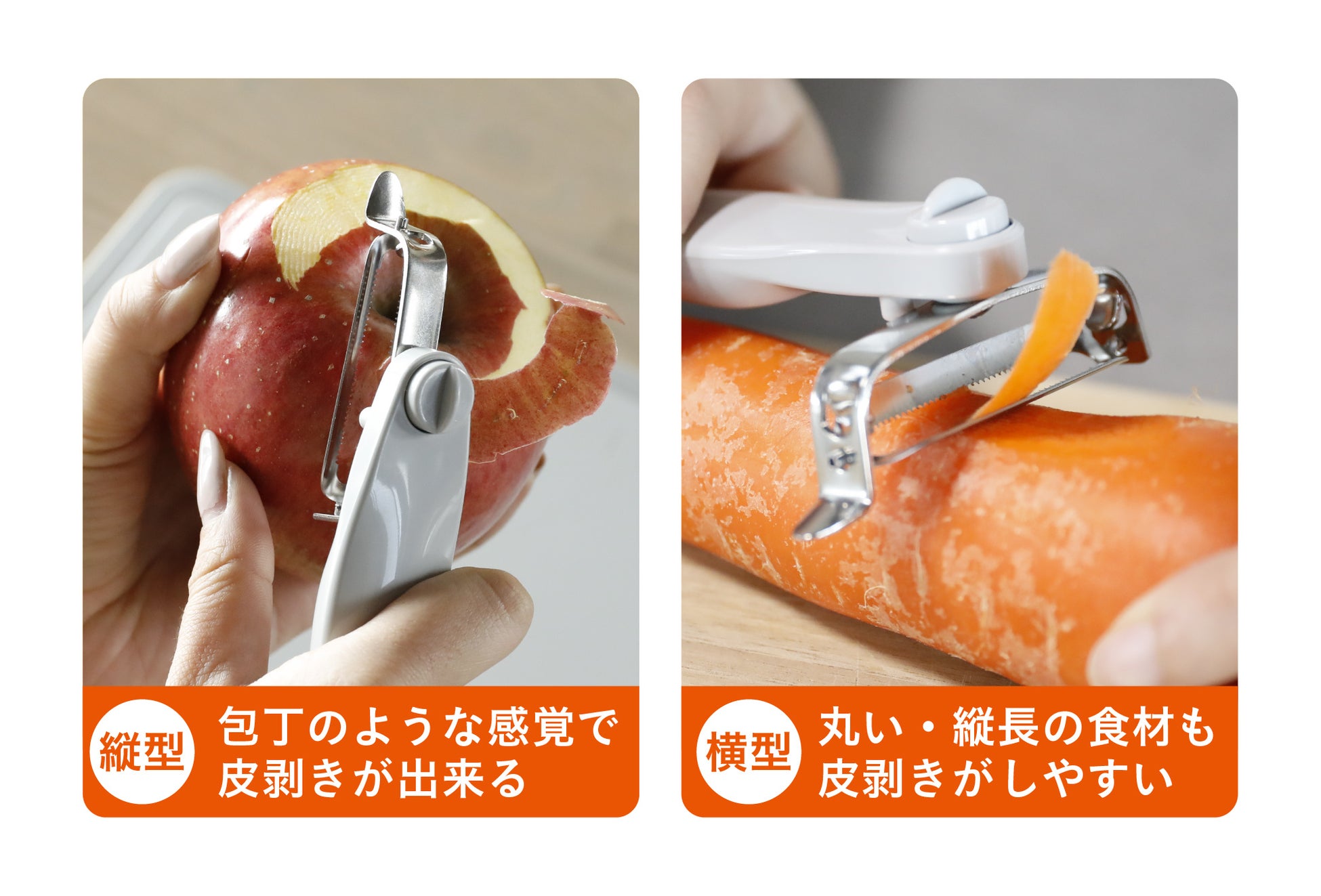 【 刃の向きを変えて皮剥きが出来る 】ゴツゴツした野菜や縦長の野菜でも、刃の向きを縦・横に変えることで食材に合わせて皮剥きが可能になります!