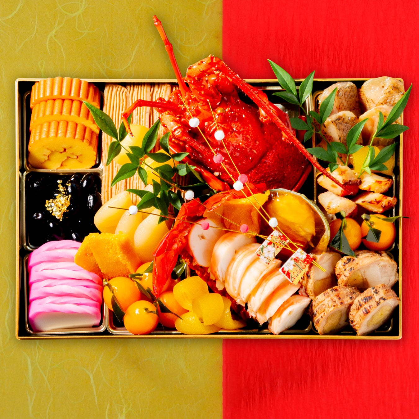 おせちに欠かせない黒豆や数の子、栗きんとんなど代表的な縁起物をはじめ、“常陸乃国いせ海老”や“つくば鶏”、“ローズポーク”、“常陸牛”など、茨城の特産品をふんだんに使用。また唐墨や鮑など高級食材も取り揃えております。ホテルの和食料理長が選りすぐりの素材で作り上げる、贅を尽くした「二段重特製おせち」をぜひご賞味ください。
