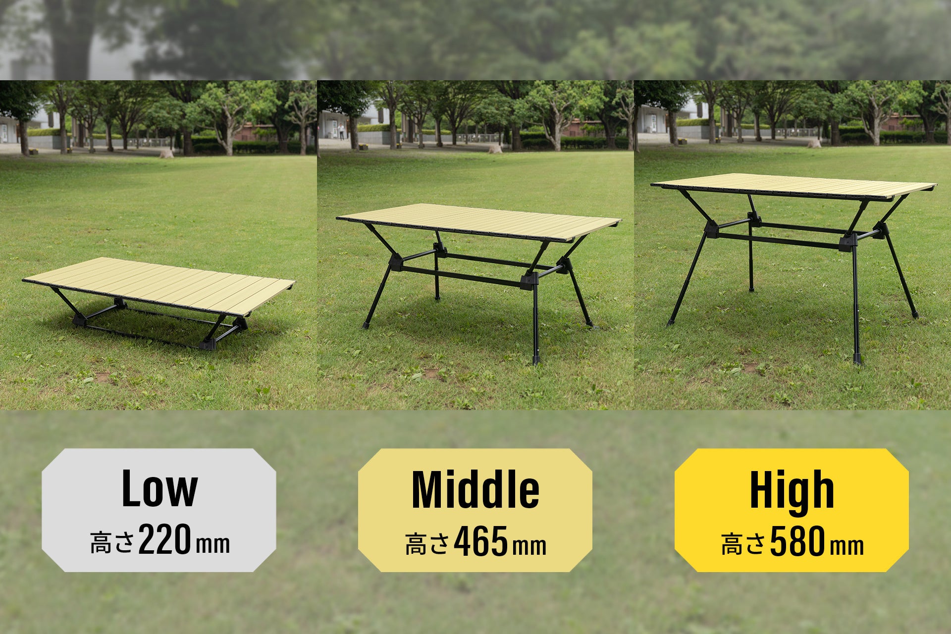 脚部ポールの高さを変更し、ロー/ミドル/ハイの3段階に高さ調整が可能です。