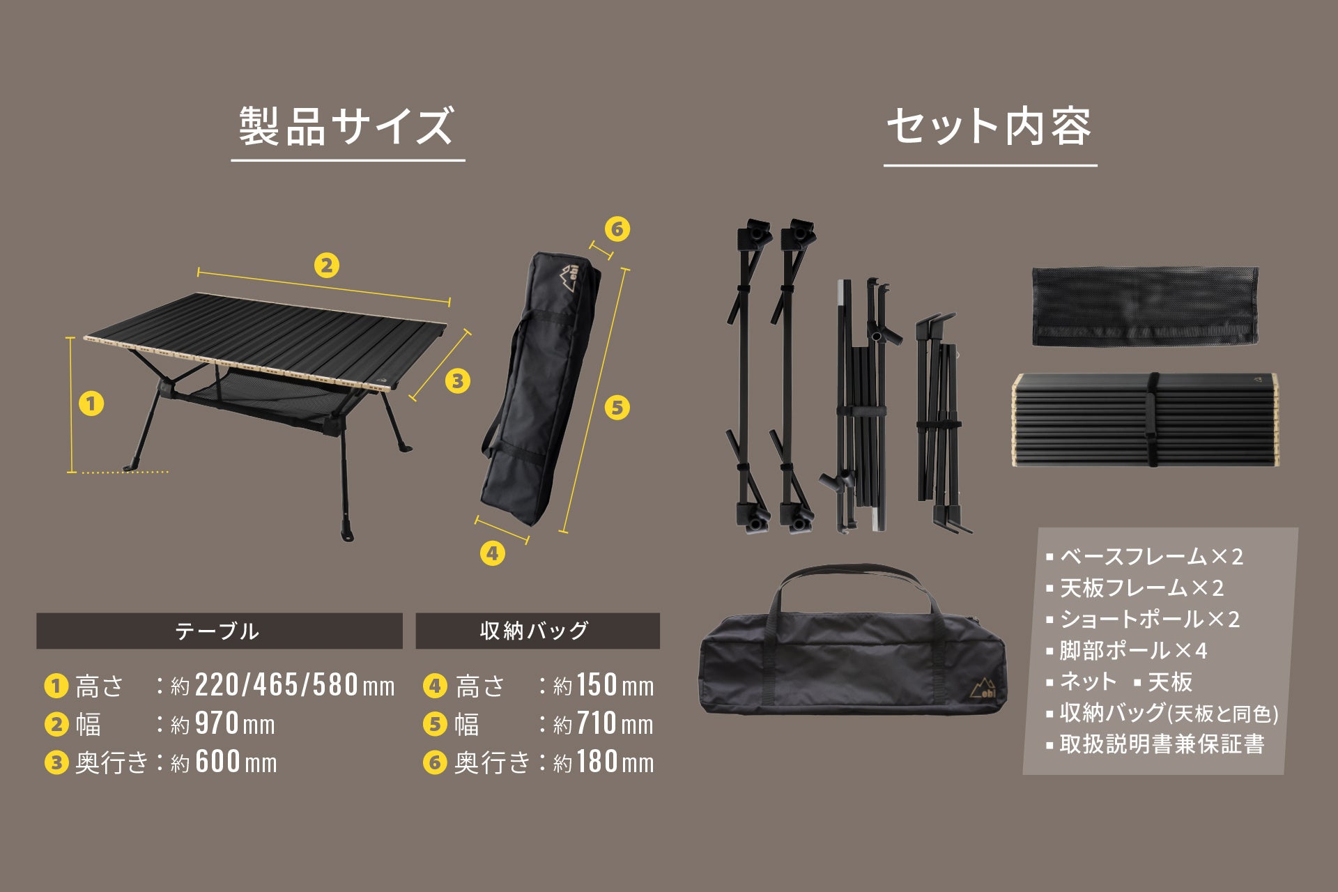 本製品は軽量アルミ素材を採用し、組み立て式でコンパクトに持ち運びが可能なアルミテーブルです。付属のバッグに本体を収納して、キャンプやバーベキューなどのアウトドアへ気軽に持ち運びができます。組み立て時は工具が不要で3段階に高さを変えられるので、使用シーンに合わせてスタイルを変更できます。また、テーブル下のスペースに付属のネットを取り付けることで、テーブル上のスペースを空けたい時にさっと物を収納できます。カラーは「ブラック」と「フィールドベージュ」の2色をご用意しています。