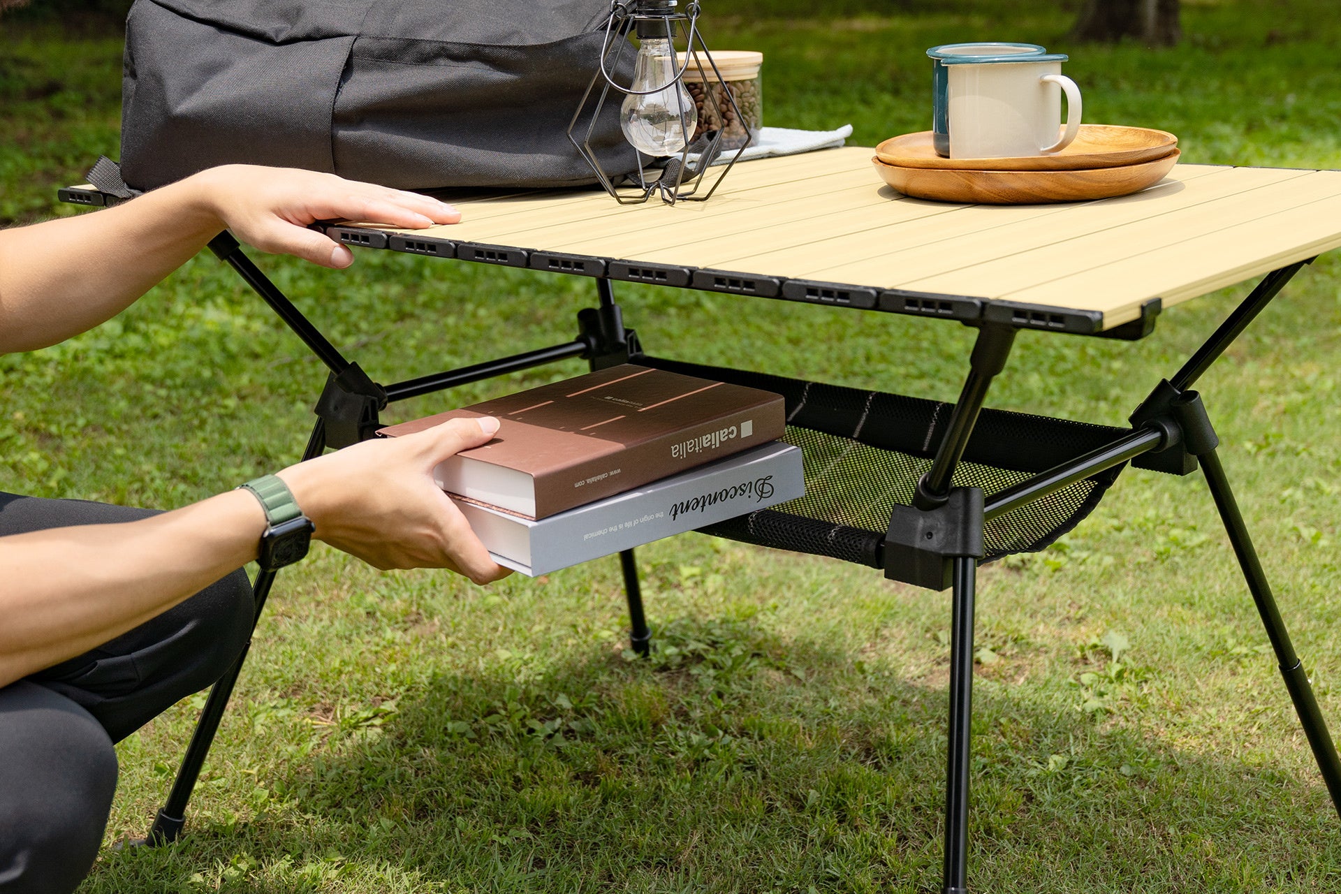 テーブル下のスペースに面ファスナー式のネットを取り付けることができます。面ファスナー式なので付け外しが簡単。置き場の少ないキャンプシーンなどではとても便利です。