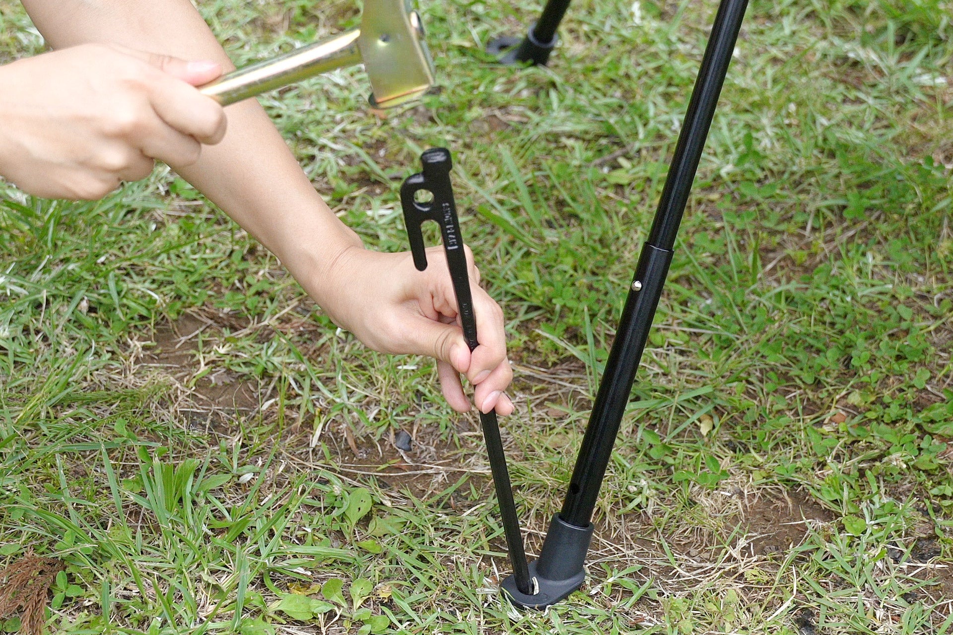 脚部ポールにはペグを通すための穴を設けました。思わぬ強風やご使用中にテーブルがずれたり横転してしまうのを防ぐため、必要に応じてペグでテーブルを地面に固定することができます。テーブルを固定することで安易な移動を防ぎ簡易的な盗難対策としても役立ちます。