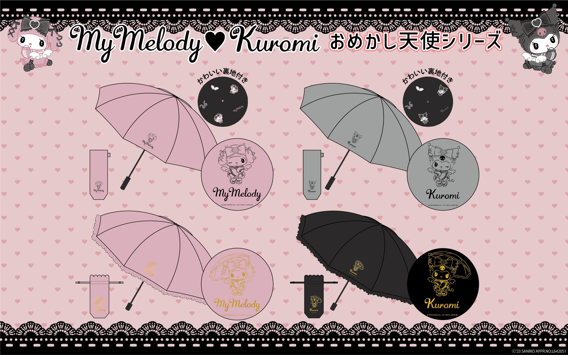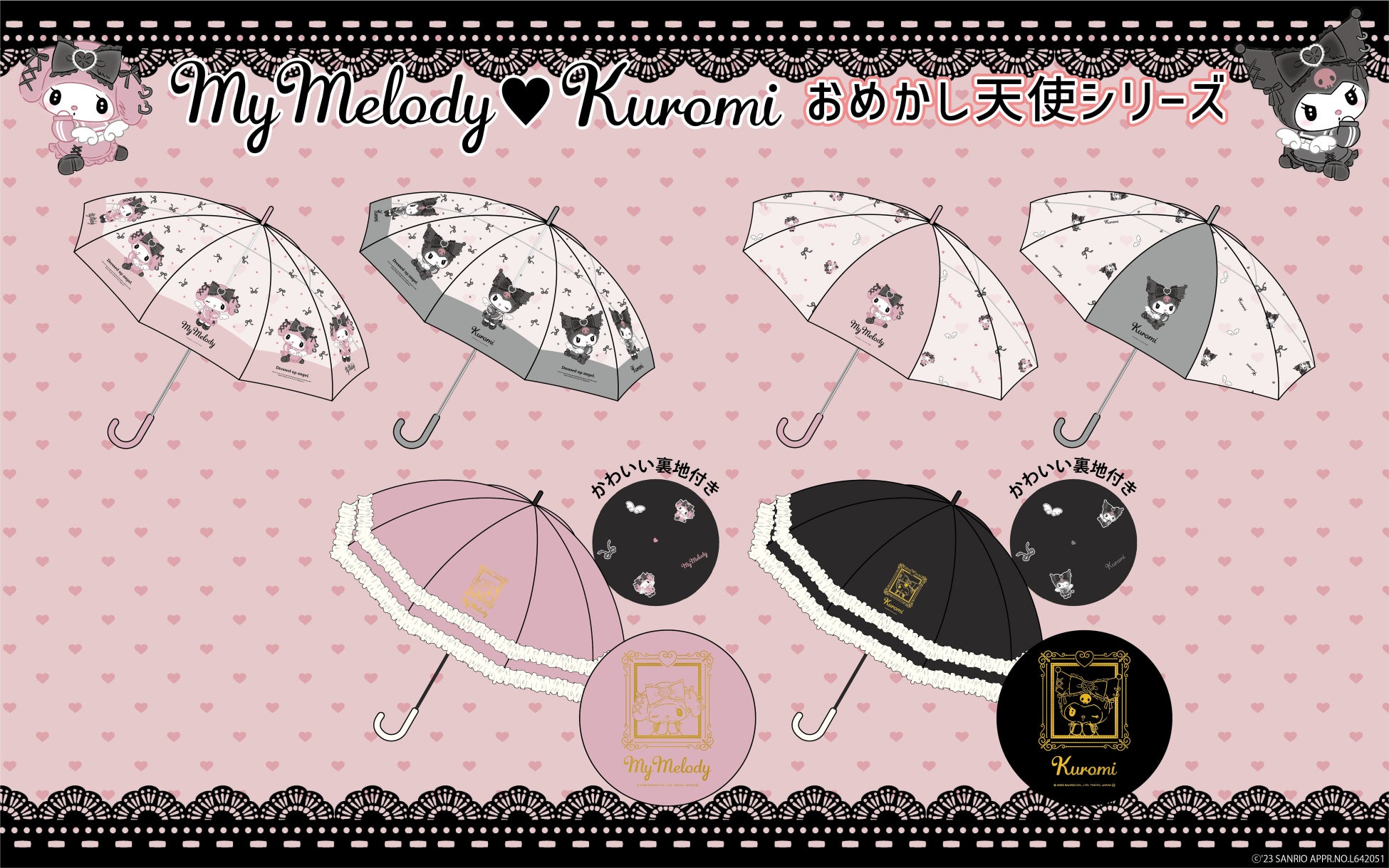 [上段]おめかし天使なマイメロディ・クロミが散りばめられたビニール傘。持ち手のカラーリングもかわいい♡雨の日もご機嫌に!