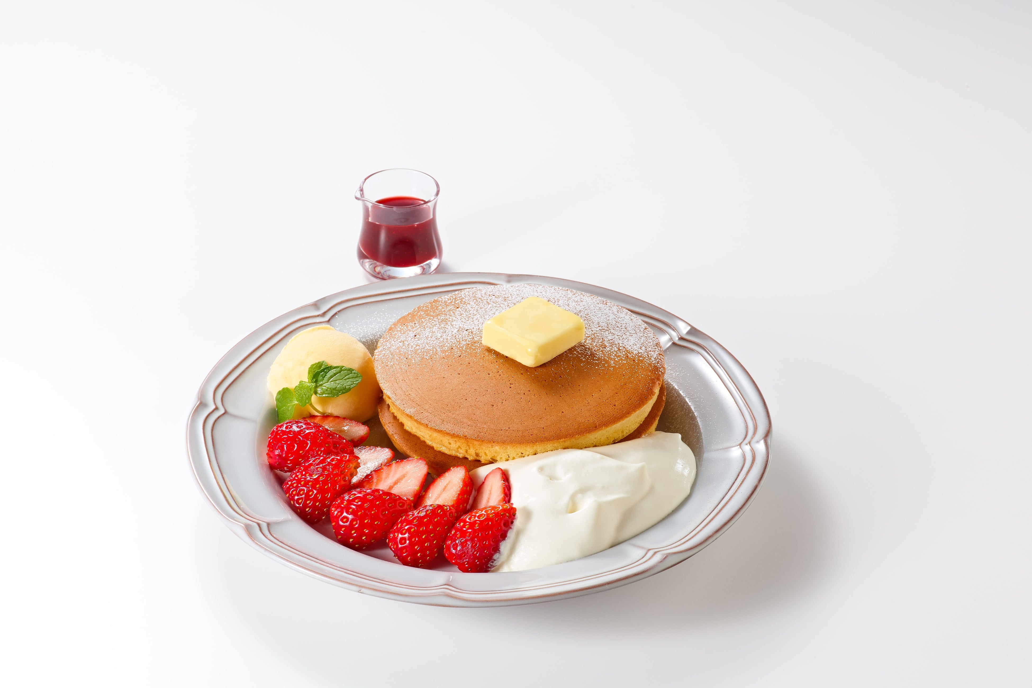 店内で1枚1枚丁寧に焼き上げた、焼きたての「トラディショナル・ホットケーキ」にフレッシュな苺、店内で手作りした特製ミルククリーム、バニラアイスをトッピングしました。