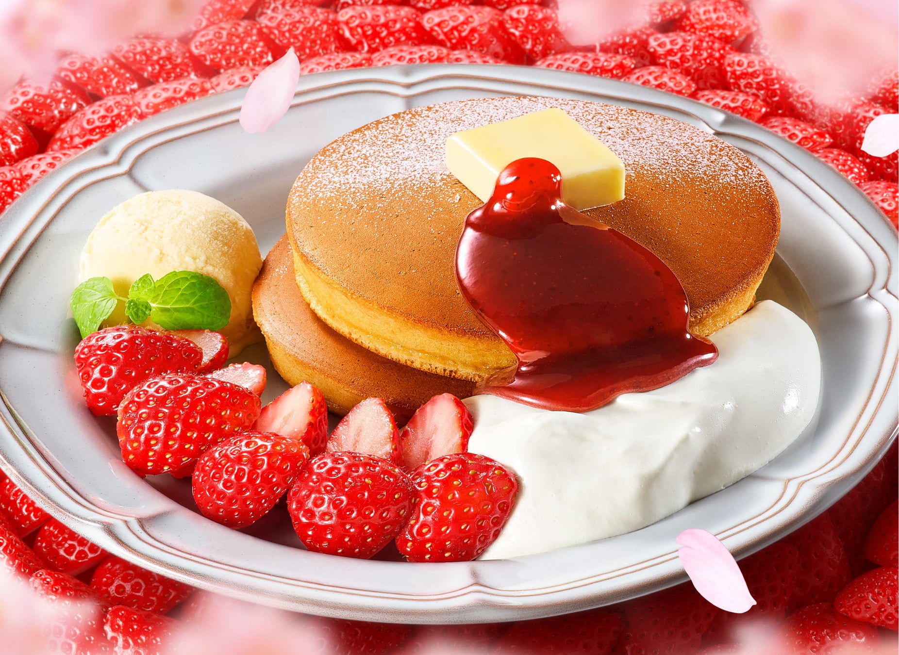 「苺のホットケーキ~特製ミルククリーム・苺ソース添え~」は、春の味覚の代表格である“苺”を存分に味わえる春限定の一品です。専用の銅板で1枚1枚丁寧に手焼きし、外はカリっと香ばしく、中はしっとりふっくら食感の「トラディショナル・ホットケーキ」に、大きめにカットしたフレッシュな苺、店内で手作りする「特製ミルククリーム」、つぶつぶ果肉の苺ソースを贅沢にトッピングし、苺づくしの一品に仕上げました。