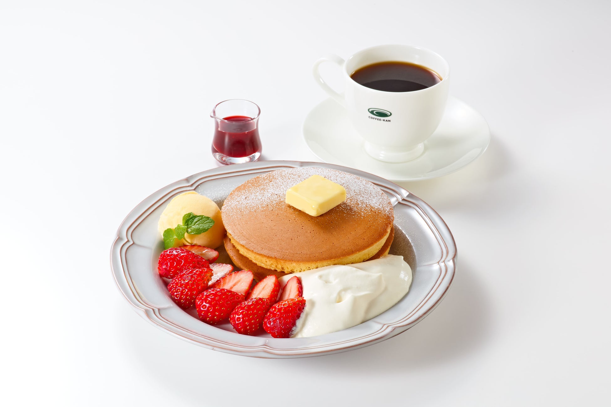 『珈琲館』にて、“苺づくし“の春スイーツが登場。焼きたてホットケーキにごろっと苺、ふんわりクリームを贅沢にトッピング!「苺のホットケーキ~特製ミルククリーム・苺ソース添え~」が3月5日(水)より新発売