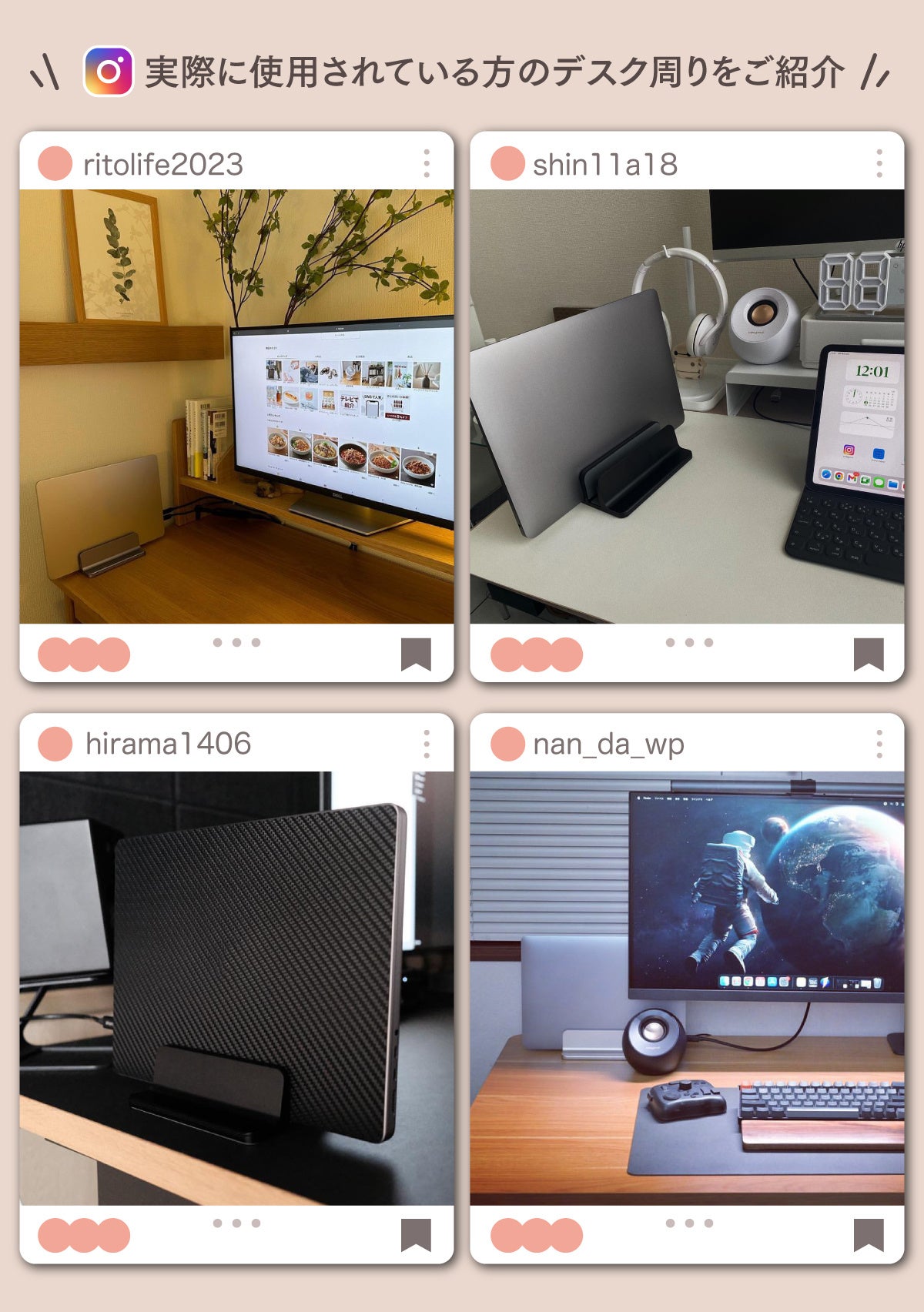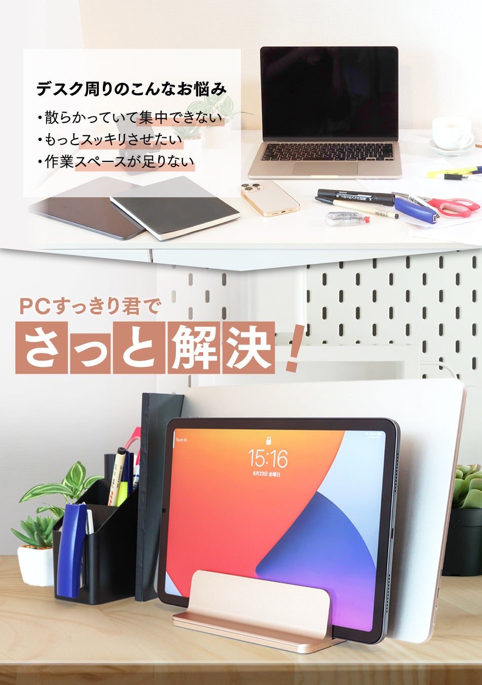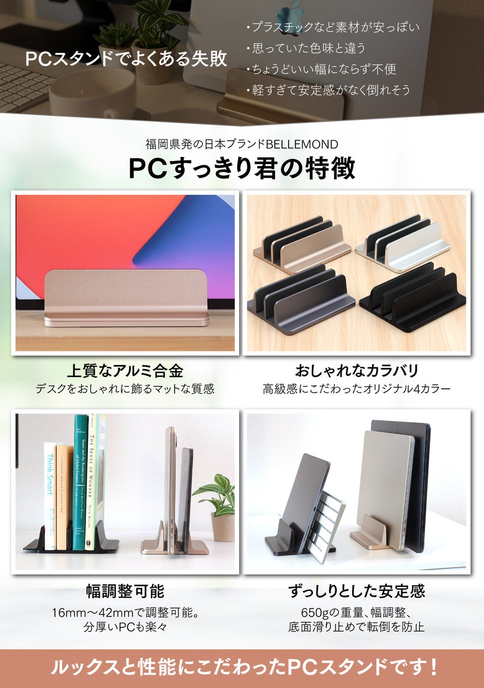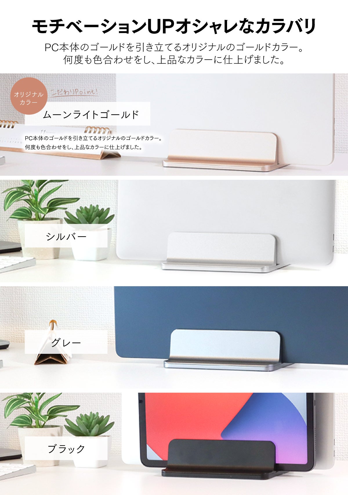 「デスク周りをすっきりさせたい」「おしゃれなデスク収納がほしい」「ラップトップを閉じたまま使いたい」そんなお悩みを解決する「PCすっきり君」スリムにも幅広にもなるオシャレな縦置きPCスタンドです。