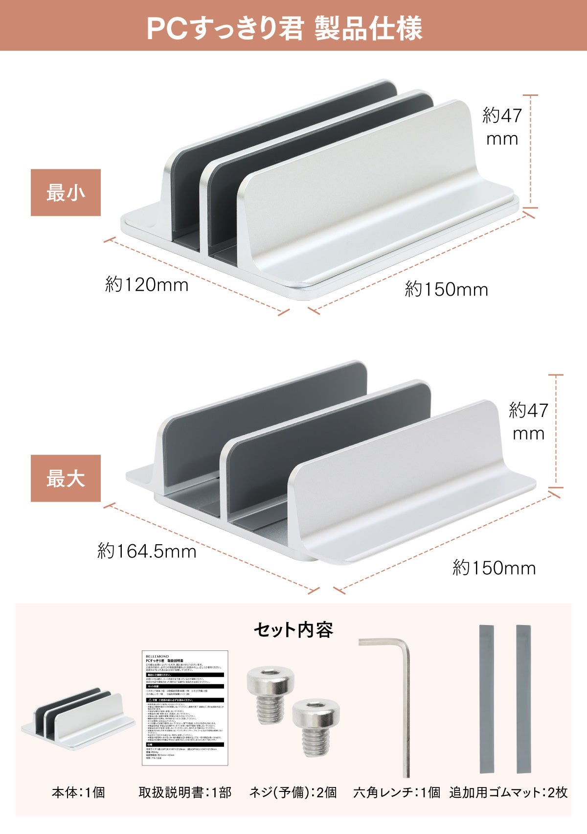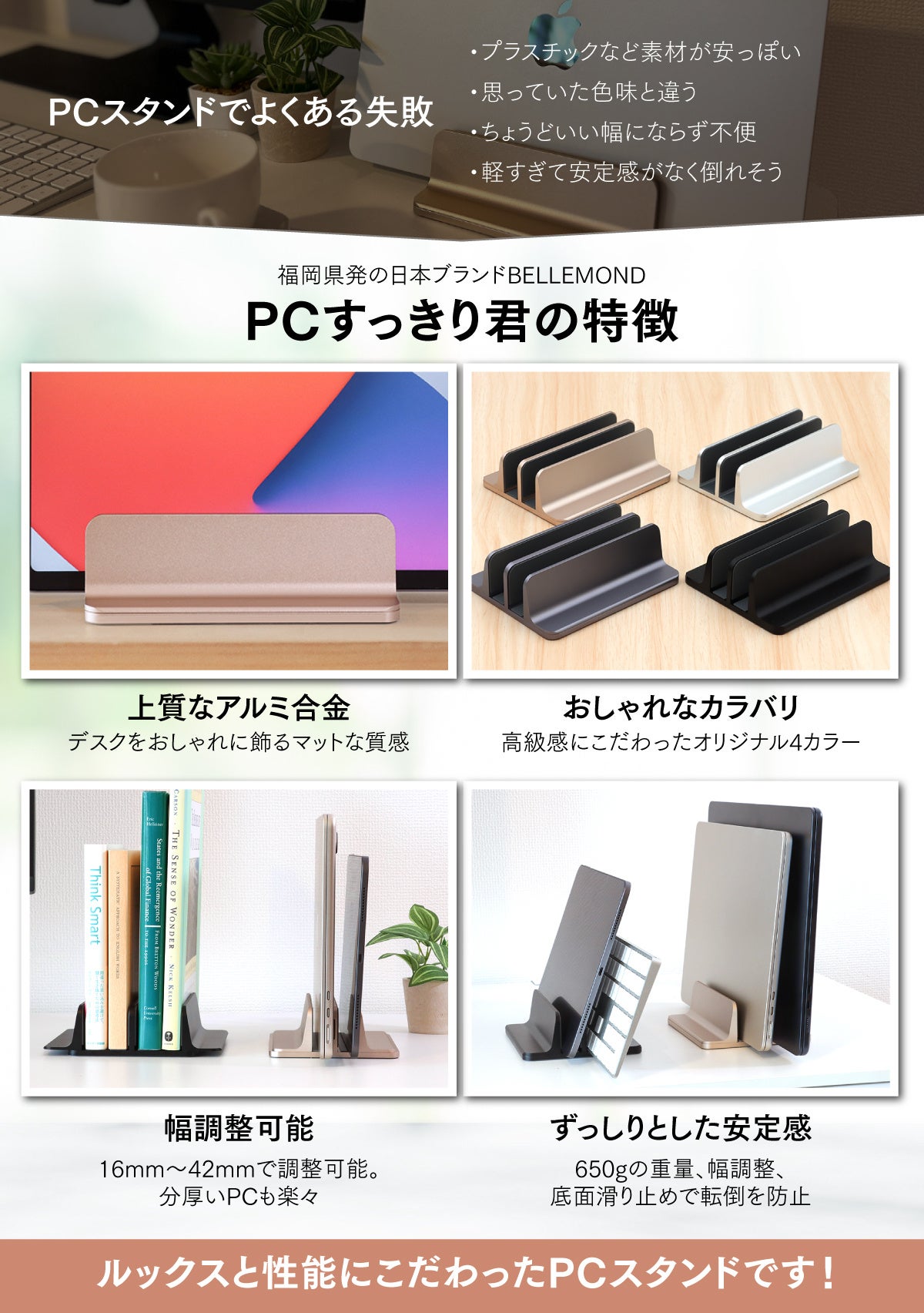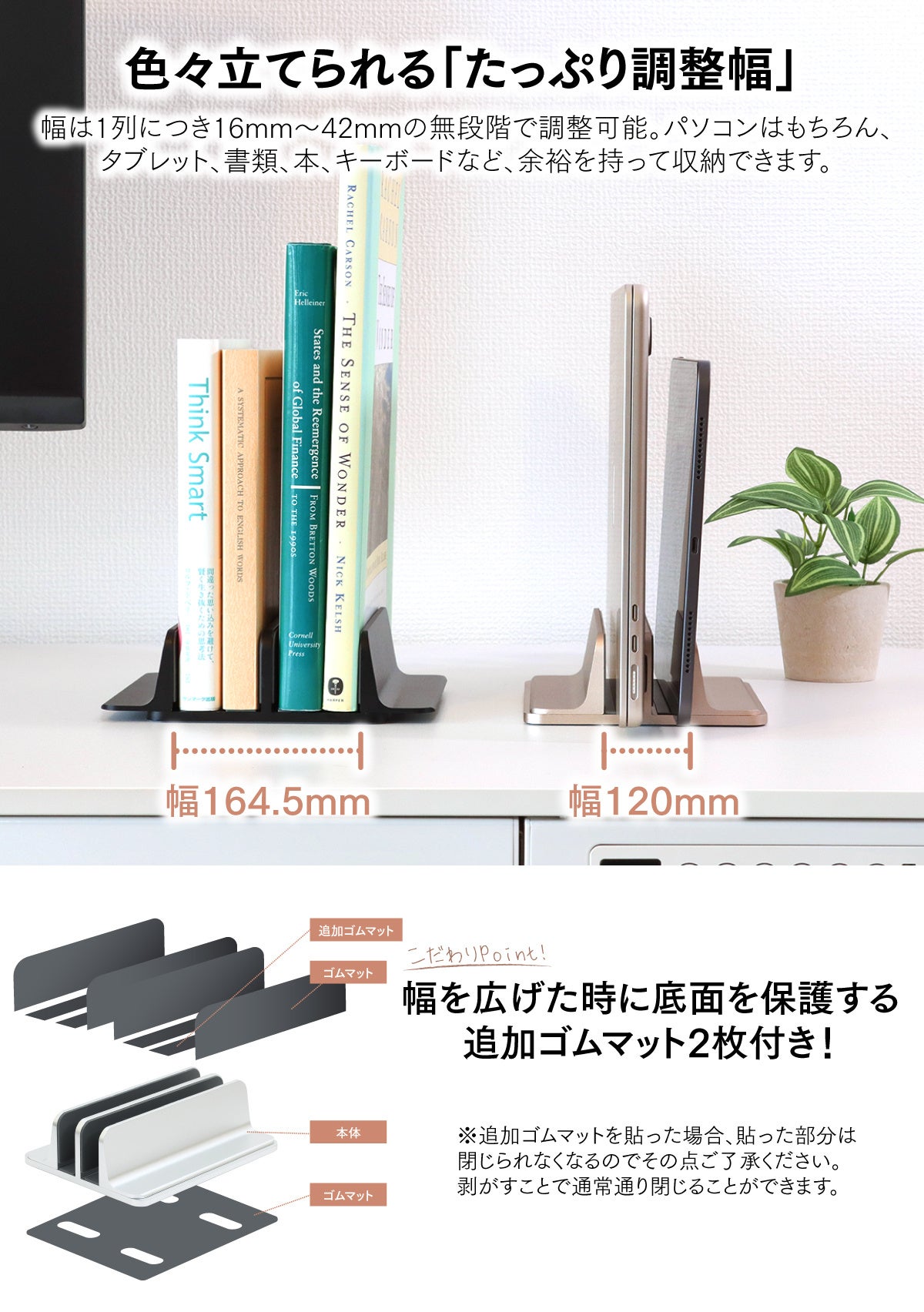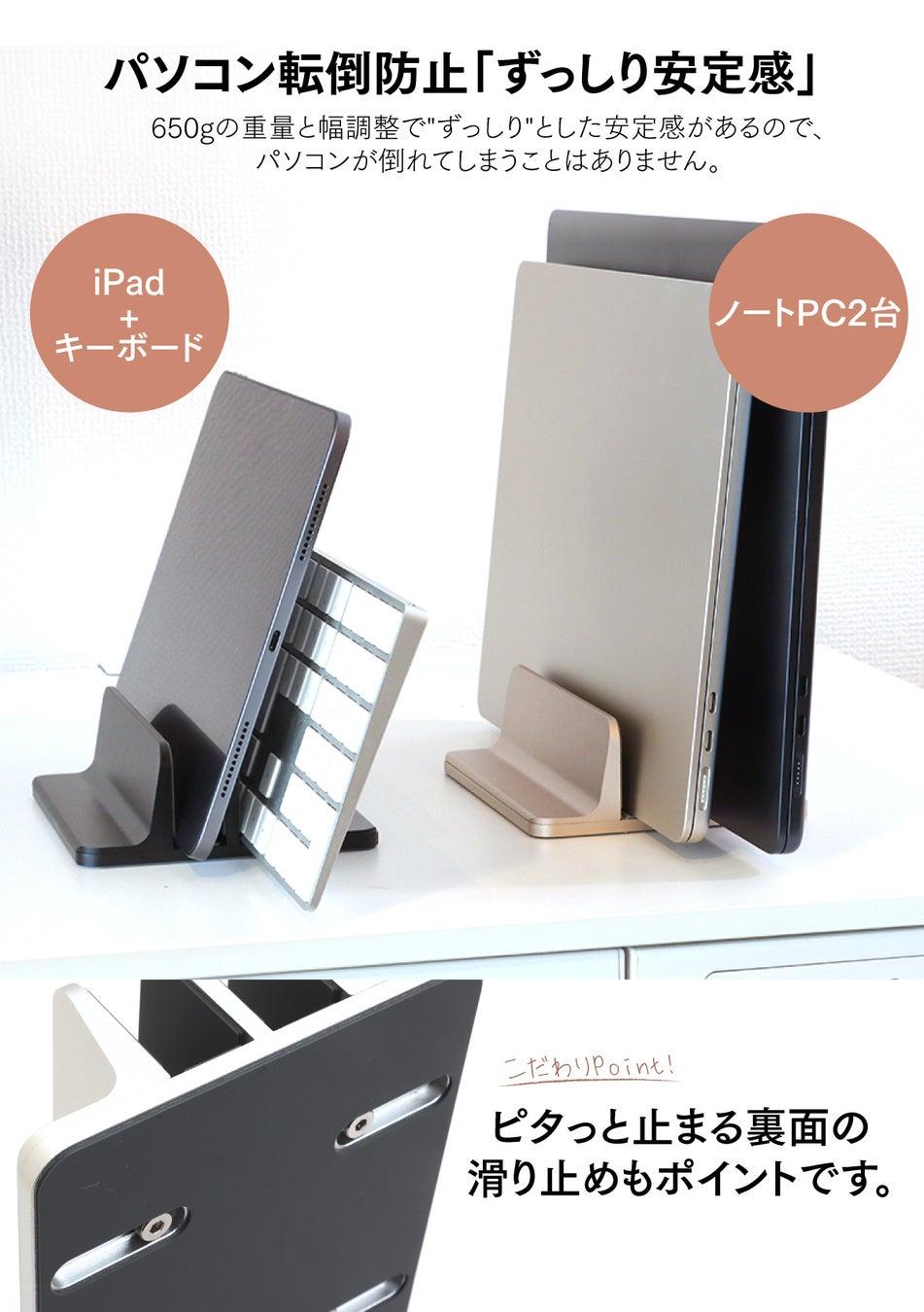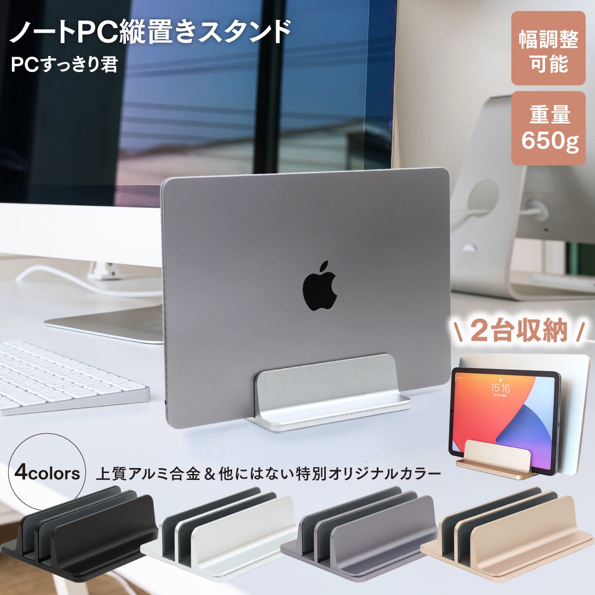上質なアルミ合金製の縦置きノートパソコンスタンド「PCすっきり君」発売!金属製でどっしりとした重量と安定感。無段階幅調整でPCやタブレットを2台以上収納可能。クラムシェルで立てて使いたい方におすすめ!