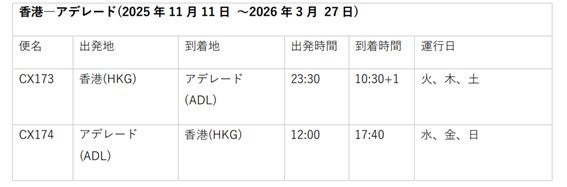 キャセイ(本社:香港、最高経営責任者:ロナルド・ラム)の航空事業、キャセイパシフィックは2025年11月11日より、冬季限定で南西太平洋地域ネットワークを拡張し、香港と南オーストラリア州の州都アデレードを結ぶ直行便の運航を週3便で再開いたします。