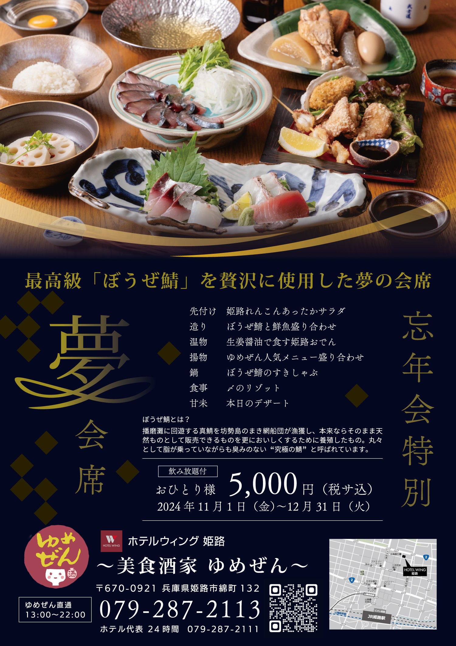 ホテルウィング姫路でもこのキャンペーンに参画し、専用プランを販売いたします。専用プランで配布される千円クーポンは当ホテル1階「美食酒家 ゆめぜん」でもご利用可能です。