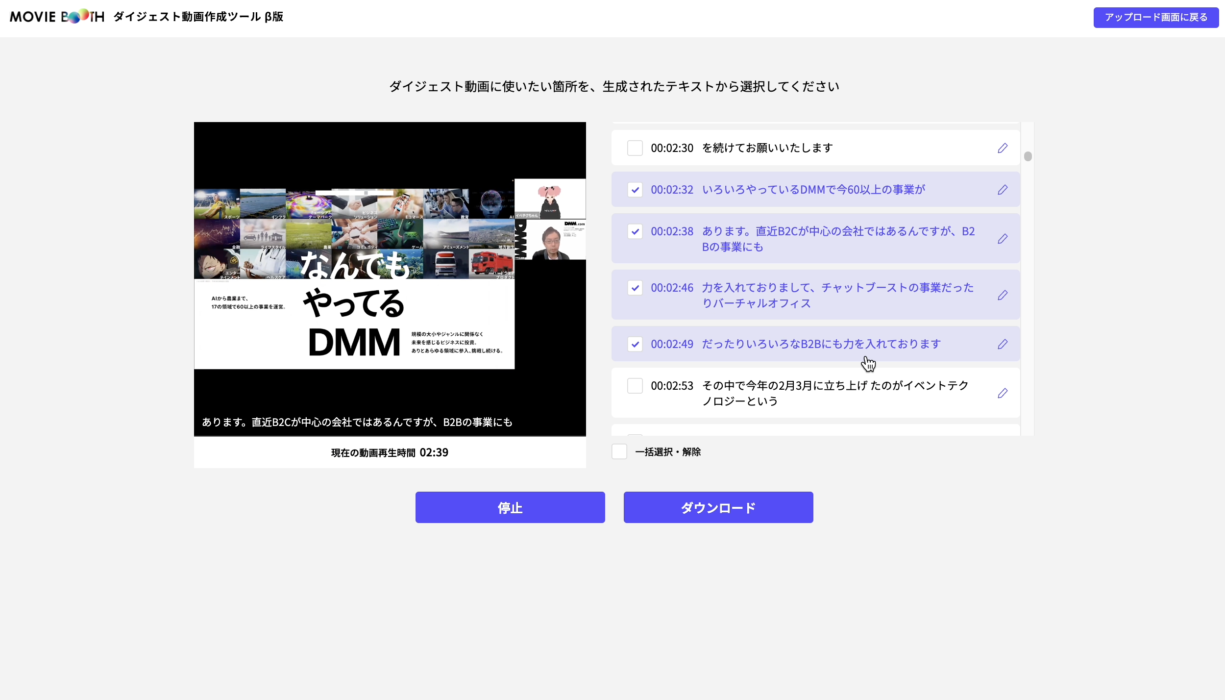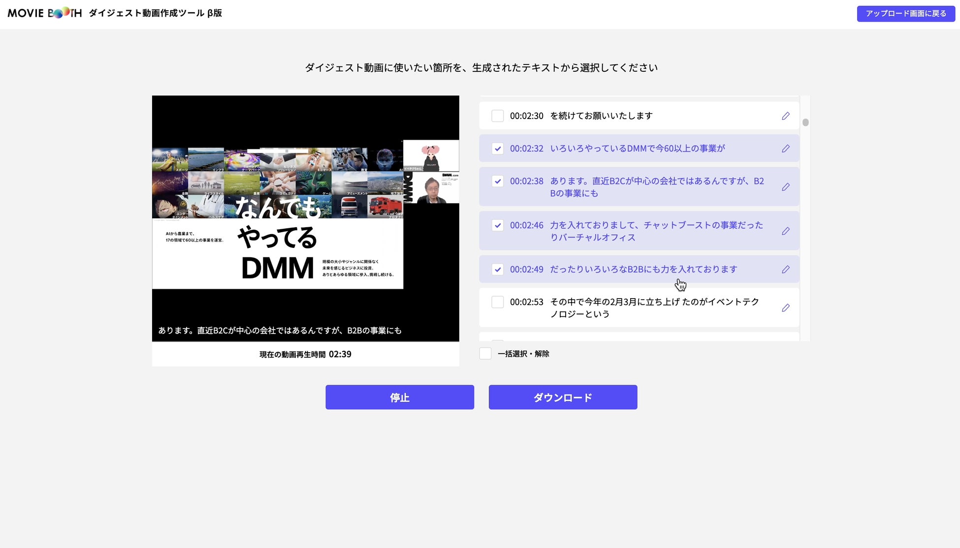 新たに追加したショート動画作成機能では、「MOVIE BOOTH」に動画をアップロードすると、映像に字幕と秒数が自動的に表示され、抜粋したい場面を選択するだけでショート動画を作成することができます。