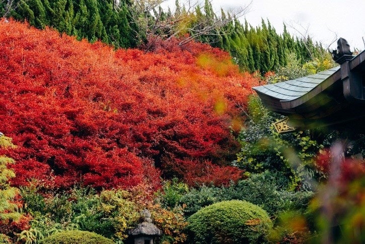 兵庫県加古川市(市長 岡田 康裕)の金城山 永昌寺では、現在「ドウダンツツジ」が見ごろを迎えています。2001年より毎年11月中旬ごろから下旬にかけて一般公開しており、多くの拝観者が訪れています。本堂から境内の斜面を真っ赤に染め、庭園の景観とともに美しい様子を鑑賞できます。また、見る角度によっては、庭園南側の本堂や北側の書院にあるガラス戸にもそれぞれ映し込んでおり、三面鏡のような美しさも楽しめます。お天気中継などでぜひご取材ください。
