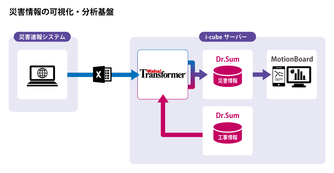 さらには、過去の支援実績もご評価いただき、結果として、災害情報を現場の用途に応じて柔軟に抽出できる環境整備に「Waha! Transformer」および「MotionBoard」を採用いただきました。