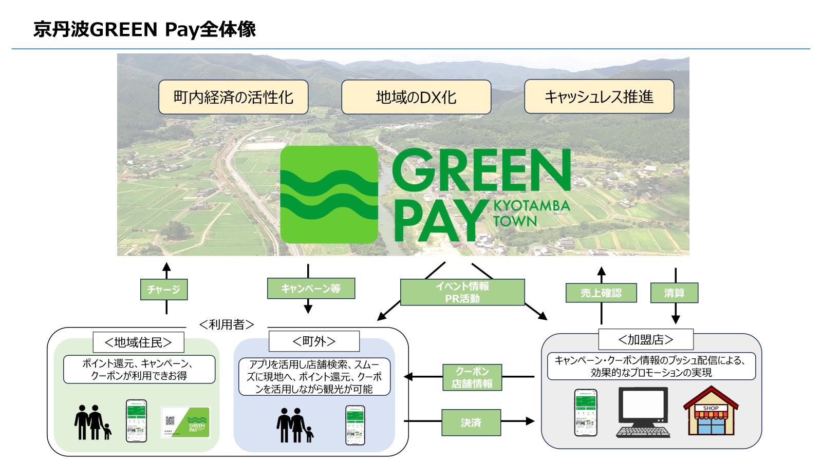 京丹波町では、「京丹波GREEN Pay」を通して、キャッシュレス決済に加え、お店・イベントの情報発信やお得なデジタルクーポンを活用し、地域経済の好循環による地域活性化を進めてまいります。