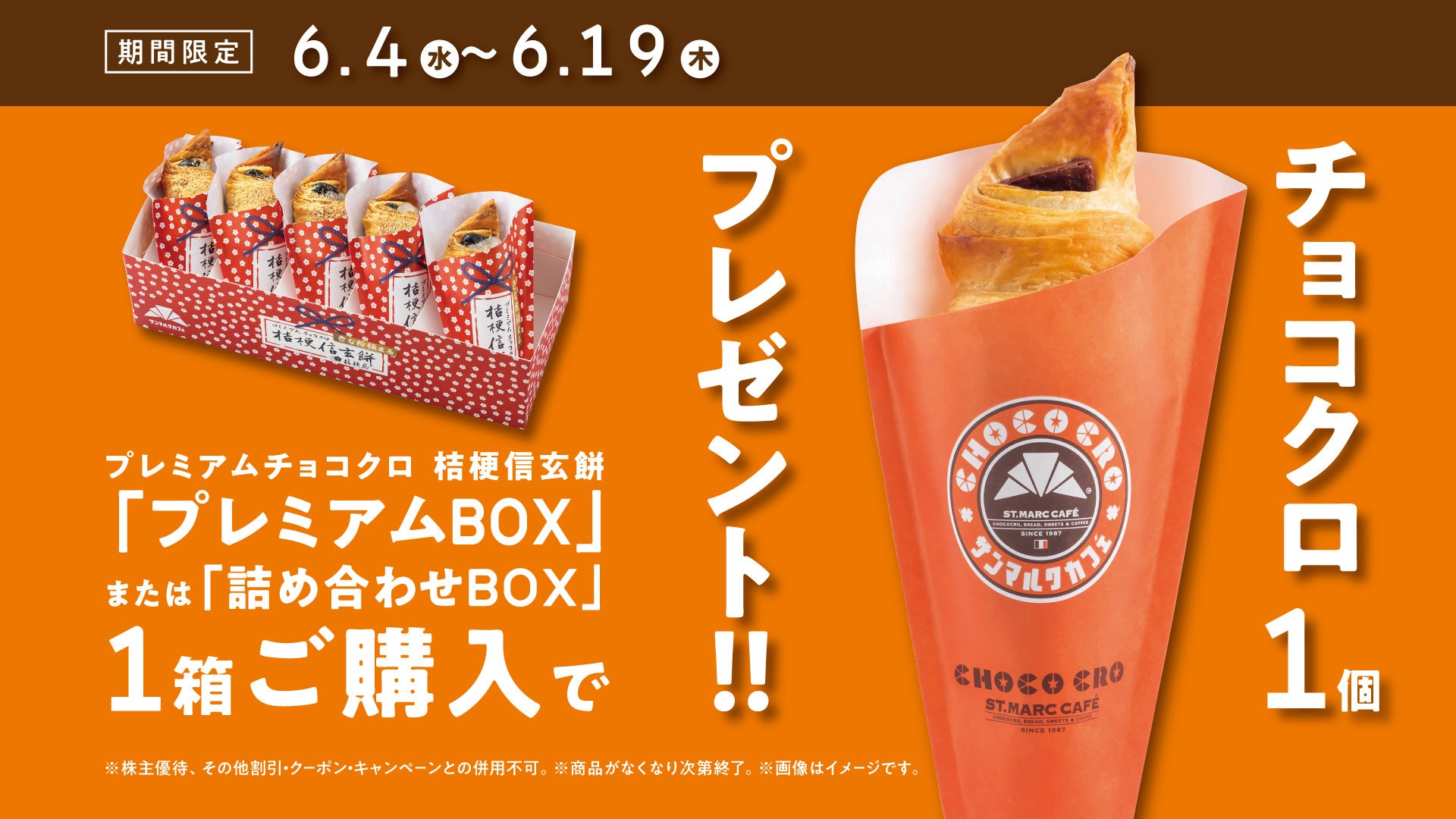 株式会社サンマルクカフェ(本社:岡山県岡山市 代表取締役社長:小山 典孝)は、「プレミアムチョコクロ 桔梗信玄餅」が入ったBOXをご購入いただいたお客様に、サンマルクカフェ定番商品「チョコクロ」をプレゼントする「チョコクロ1個プレゼントキャンペーン」を、6月4日(水)から6月19日(木)まで開催いたします。