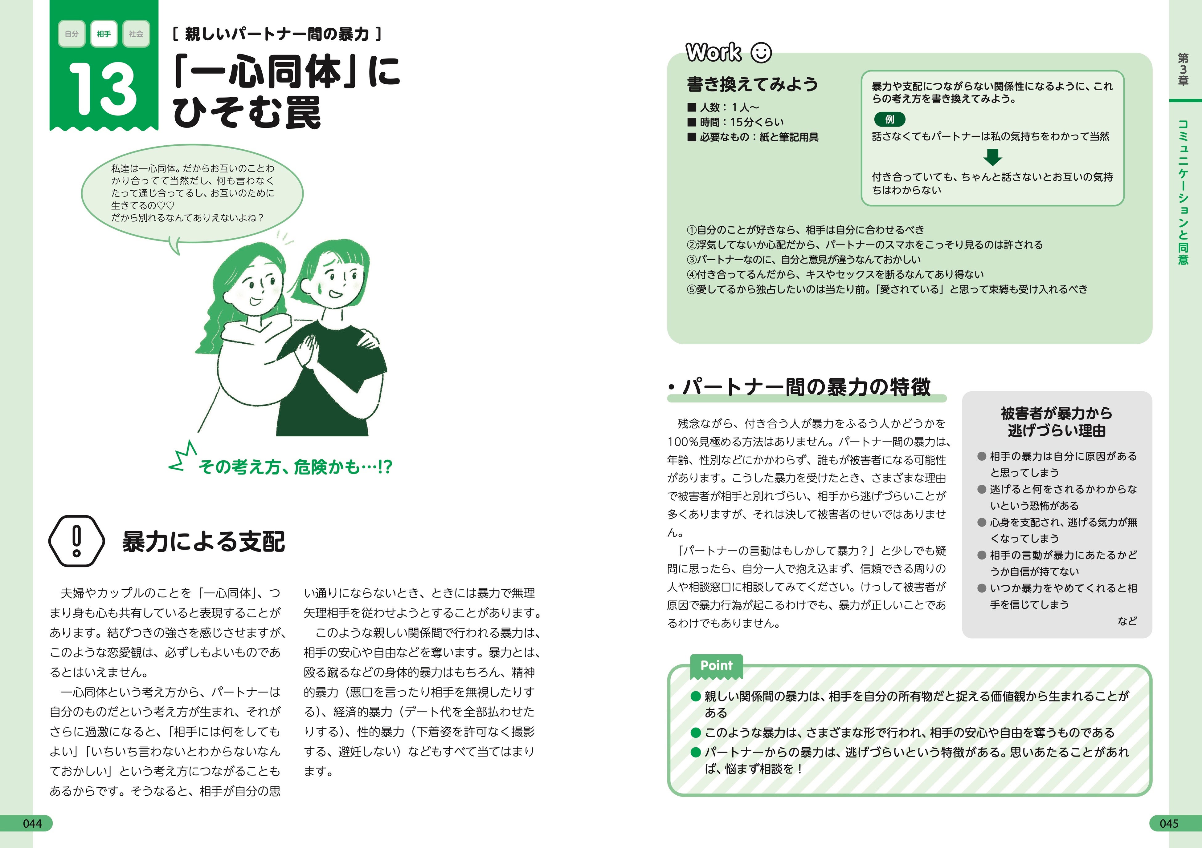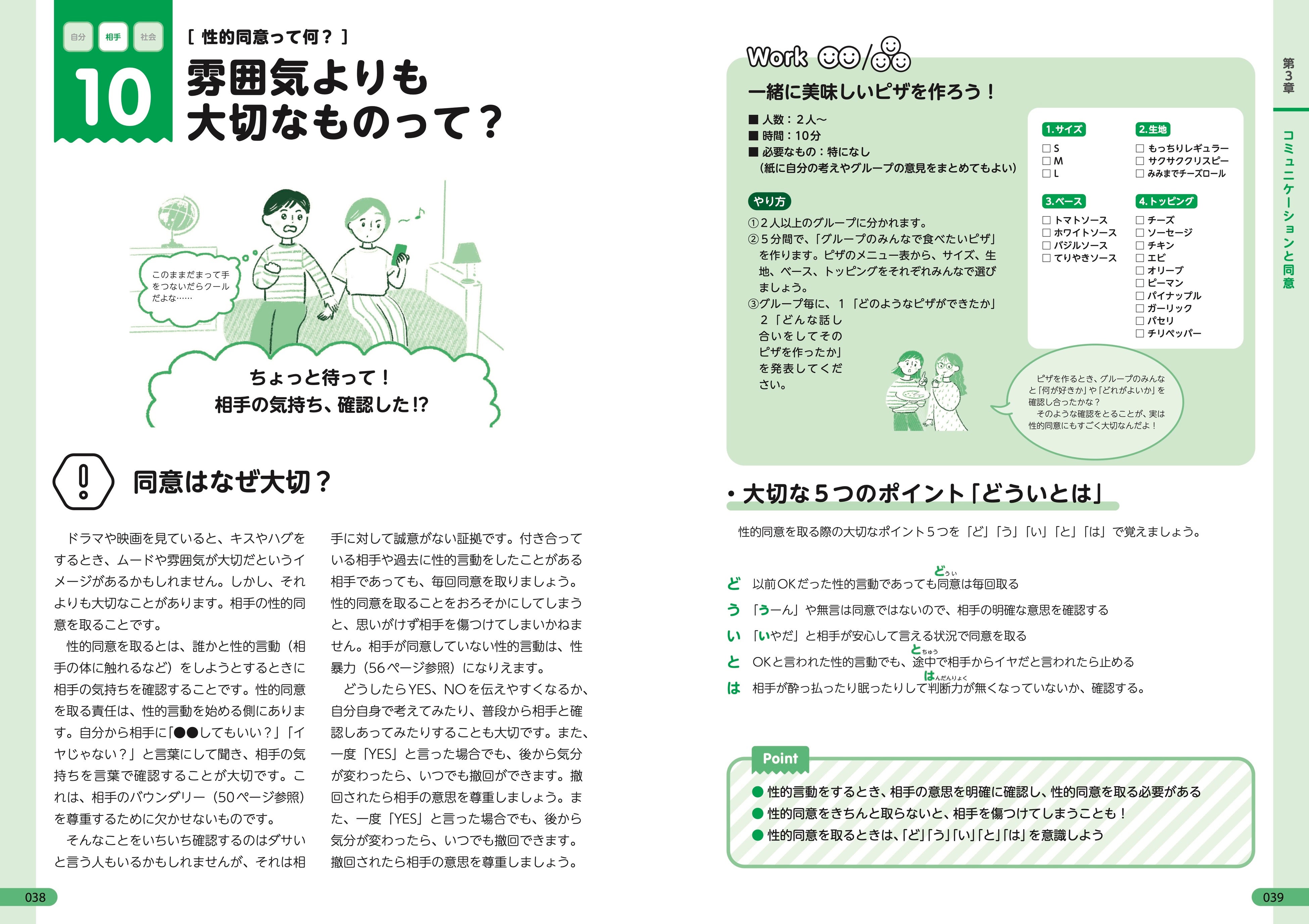 基本的な知識からトラブル、法律に関する情報まで、周りの人とのコミュニケーションを中心に、イラストつきでわかりやすく解説しています。より自分ごととして考えやすいように、自分で考えたり、ほかの人と話すきっかけを作れるワークを用意しました。ぜひグループやクラスでワークに取り組んでみてください。