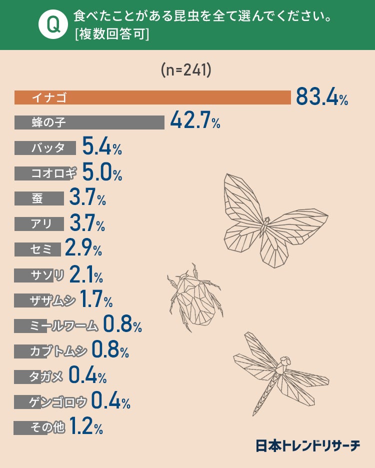 これまでに昆虫を食べたことがある方の多くは、「イナゴ」や「蜂の子」を食べたようです。