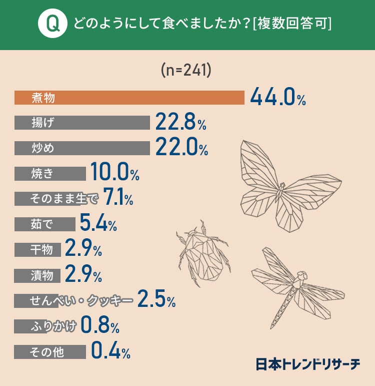 これまでに食べたことがある昆虫について聞いたところ、「イナゴ」と回答した方がもっとも多かったですが、食べてみたい昆虫については「蜂の子」と回答した方がもっとも多くなりました。