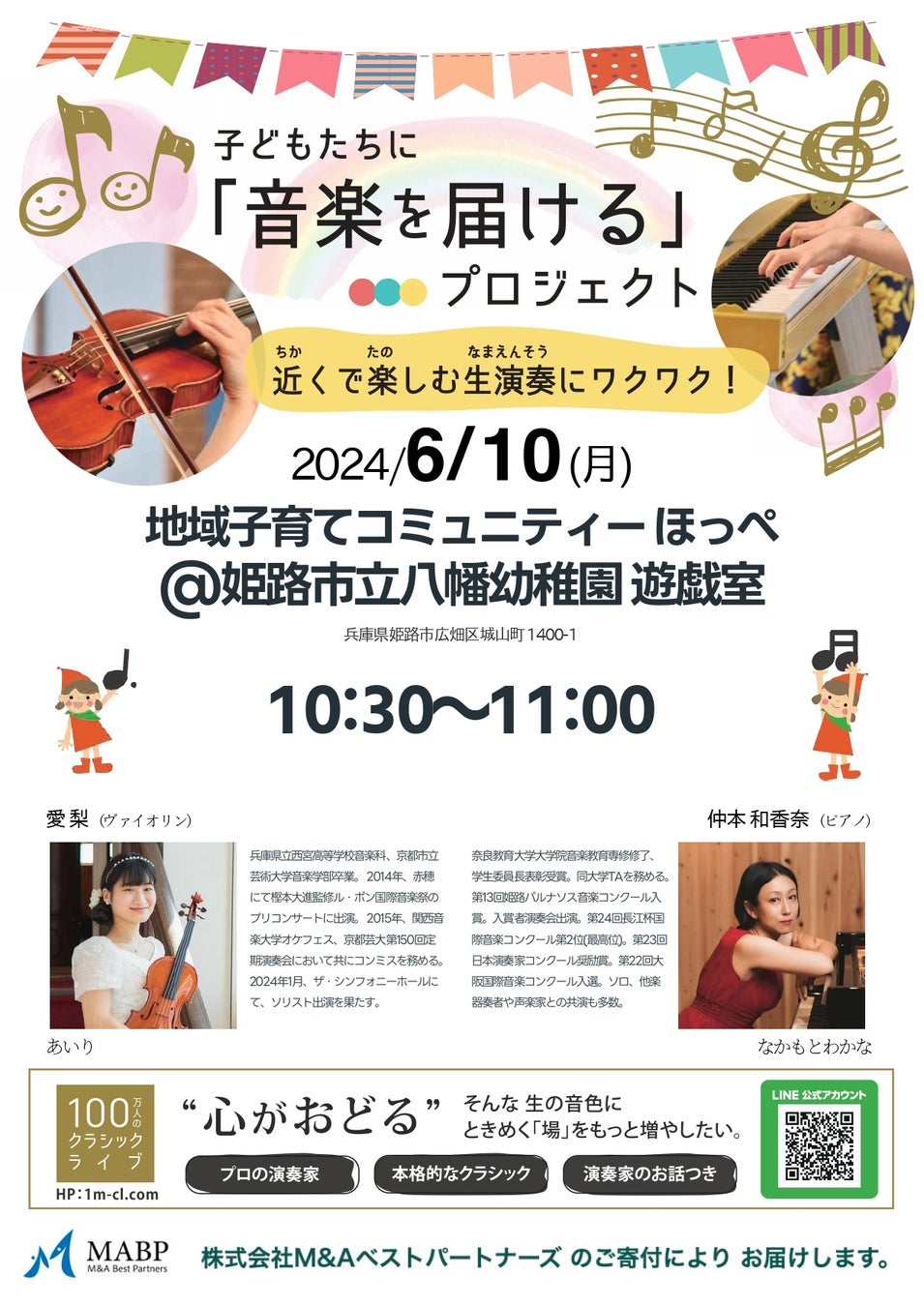 【M&Aベストパートナーズ×100万人のクラシックライブ】6月10日(月)に姫路市立八幡幼稚園 遊戯室にて、クラシックライブを開催!