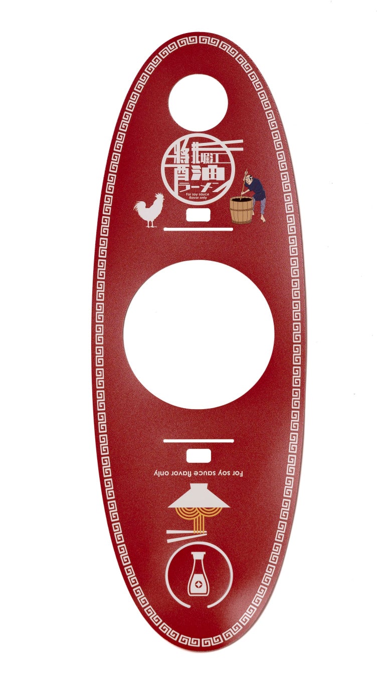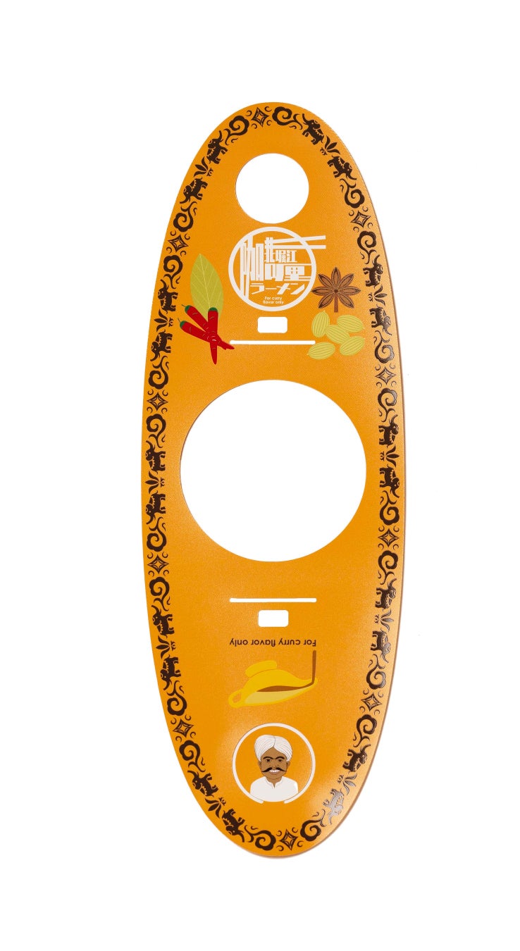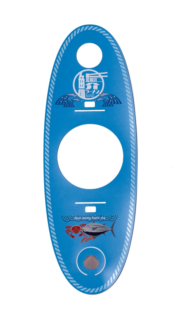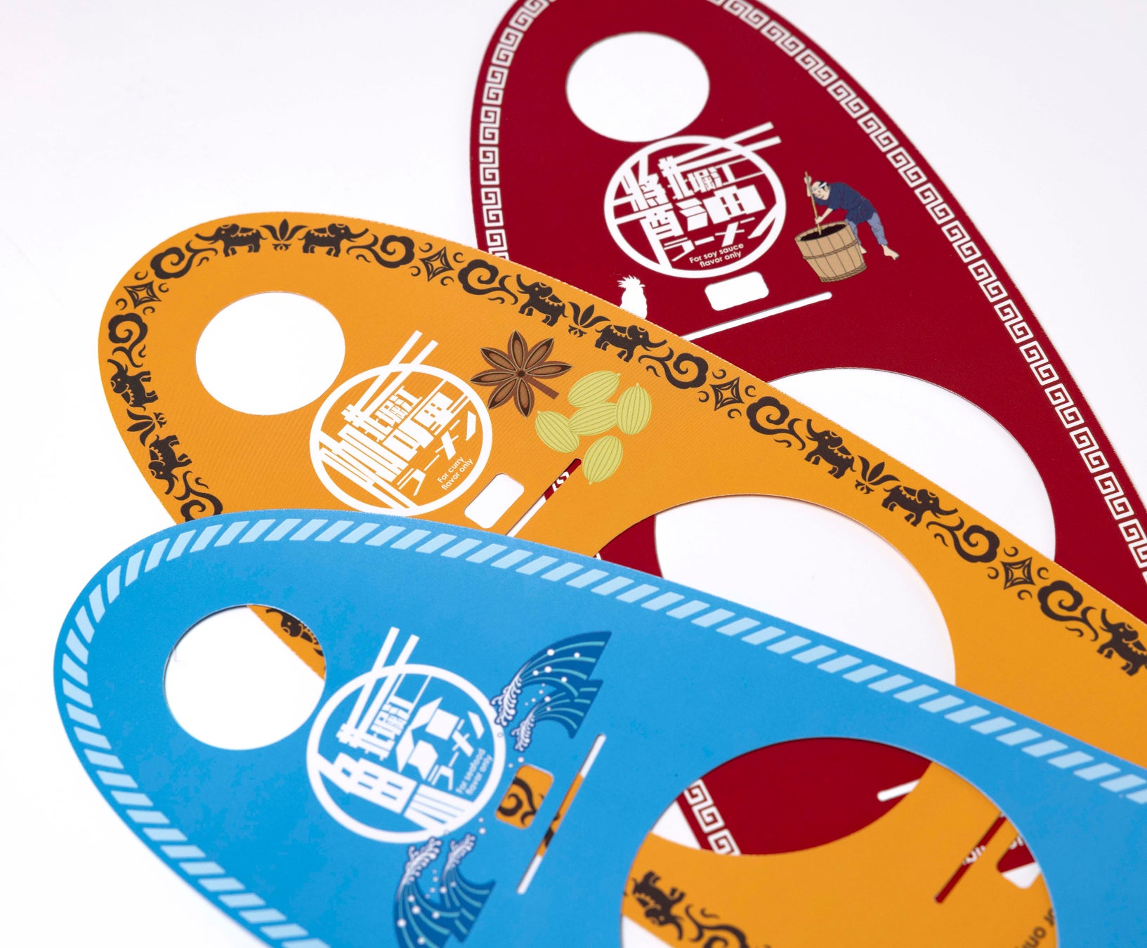 印刷素材にはユポを選択。さらにデザインは定番のしょうゆ、シーフード、カレー味の3種類分を制作しました。