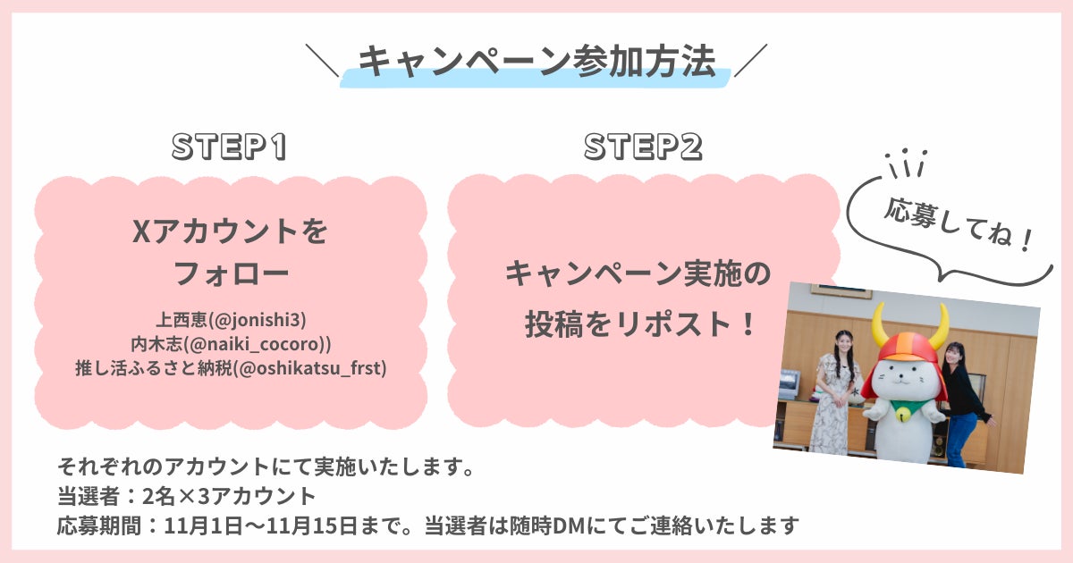 滋賀県彦根市と株式会社あるやうむ(所在地:北海道札幌市、代表取締役:畠中 博晶)は、2024年10月11日(金)より、推し活ふるさと納税として「ひこにゃん×上西恵」、「ひこにゃん×内木志」の2ショットチェキの返礼品を提供開始しました。今回、推し活ふるさと納税のコラボ記念としたSNSプレゼントキャンペーンを実施いたします。それぞれのXアカウントから応募が可能です。ぜひご応募お待ちしております。