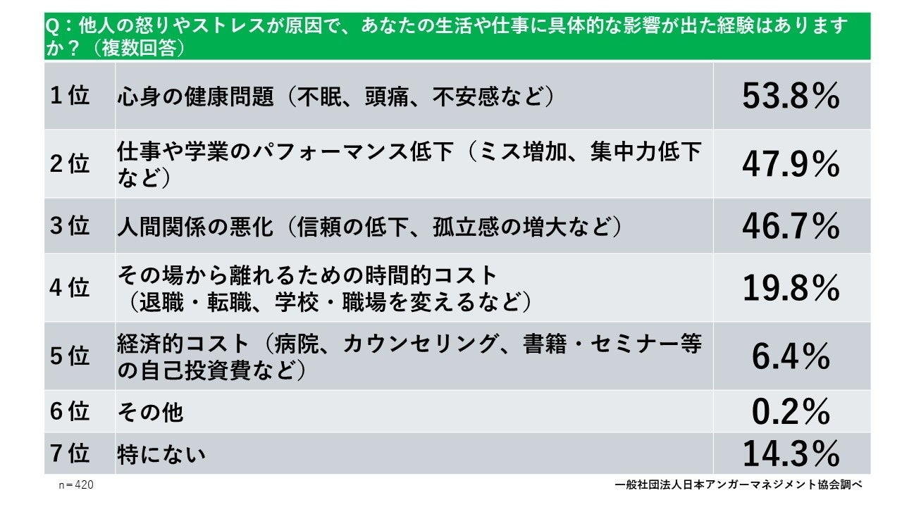 さらに、仕事や学業のパフォーマンス低下を経験した人は47.9%、人間関係の悪化を経験した人は46.7%に上る。他人の怒りは、個人の健康だけでなく、仕事の質や人間関係にまで広範囲な悪影響を及ぼしているのが現実です。