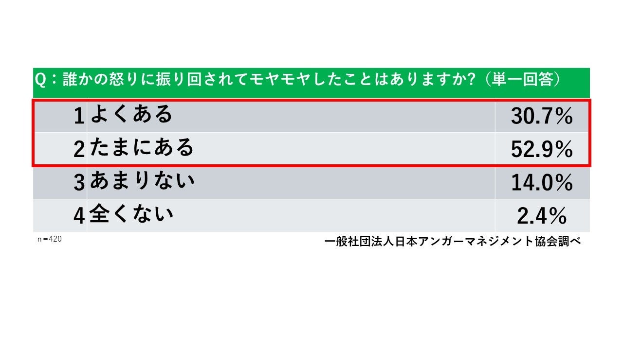 「誰かの怒りに振り回されてモヤモヤしたことがある」と回答した人は 83.6% にのぼりました。