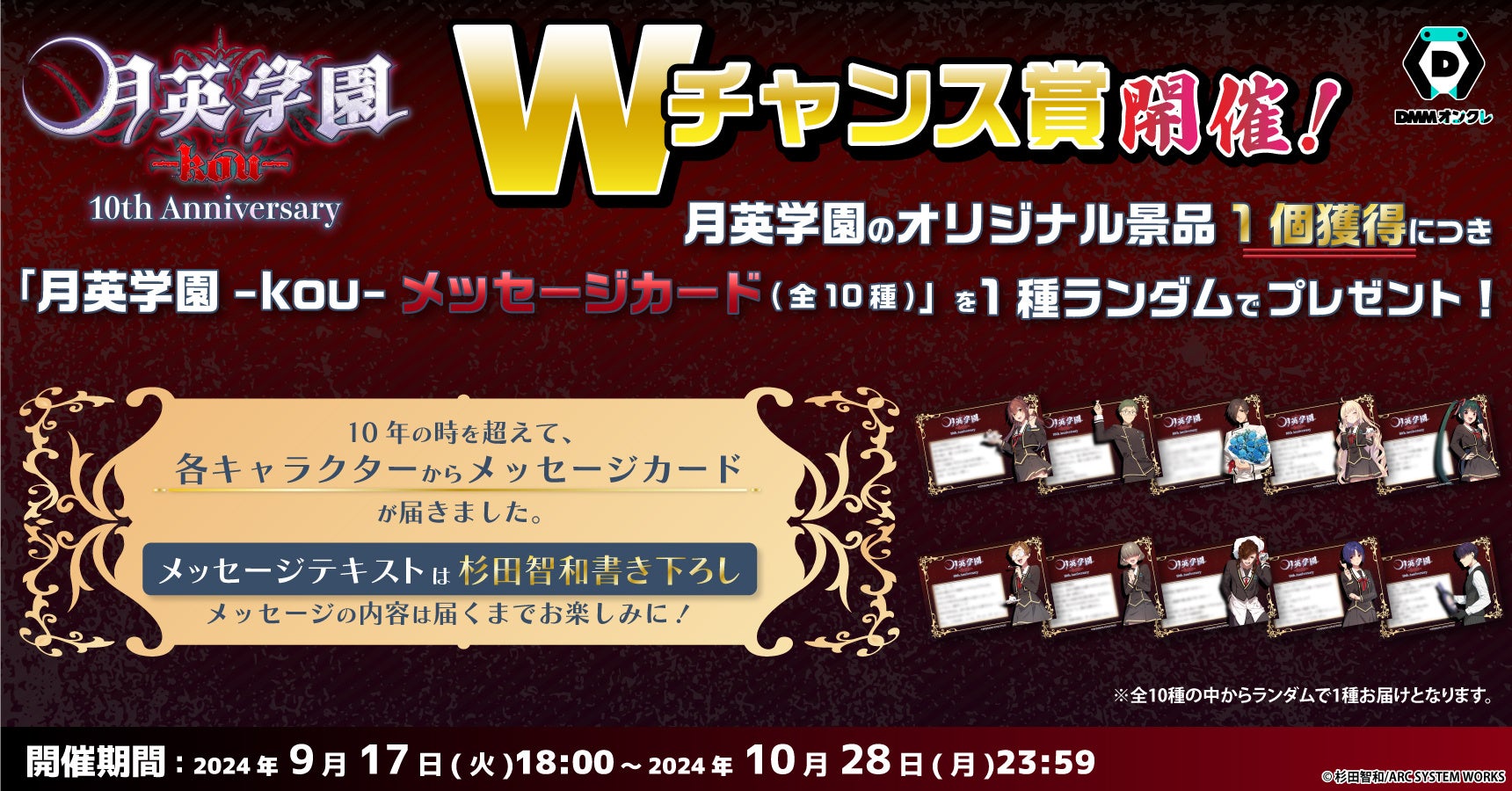 「月英学園-kou-」オリジナル景品を1個獲得につき、もれなく「月英学園-kou- メッセージカード(全10種)」がランダムで1種付いてくるWチャンス賞を同時開催します。