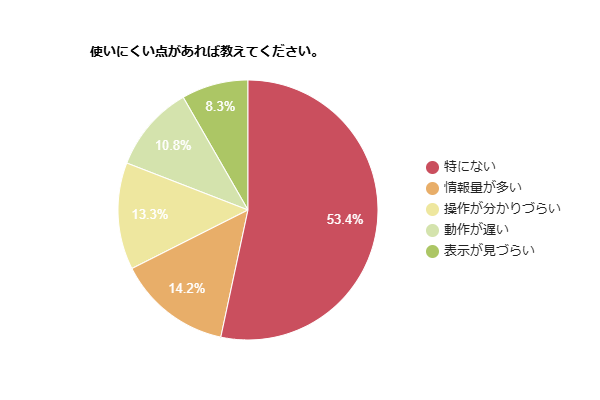 使いにくさに関する回答では、「特にない」(53.4%)が過半数を占めました。一方で、「情報量が多い」(14.2%)や「操作が分かりづらい」(13.3%)、「動作が遅い」(10.8%)といった回答も一定数ありました。