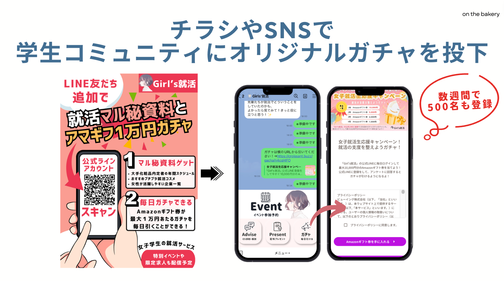 配布したチラシには「LINE友達追加で就活マル秘資料とアマギフ1万円ガチャ」という文字を大きく目立たせたことで、就活生の興味を掻き立て、LINEの登録数UPにつながったと思っています。