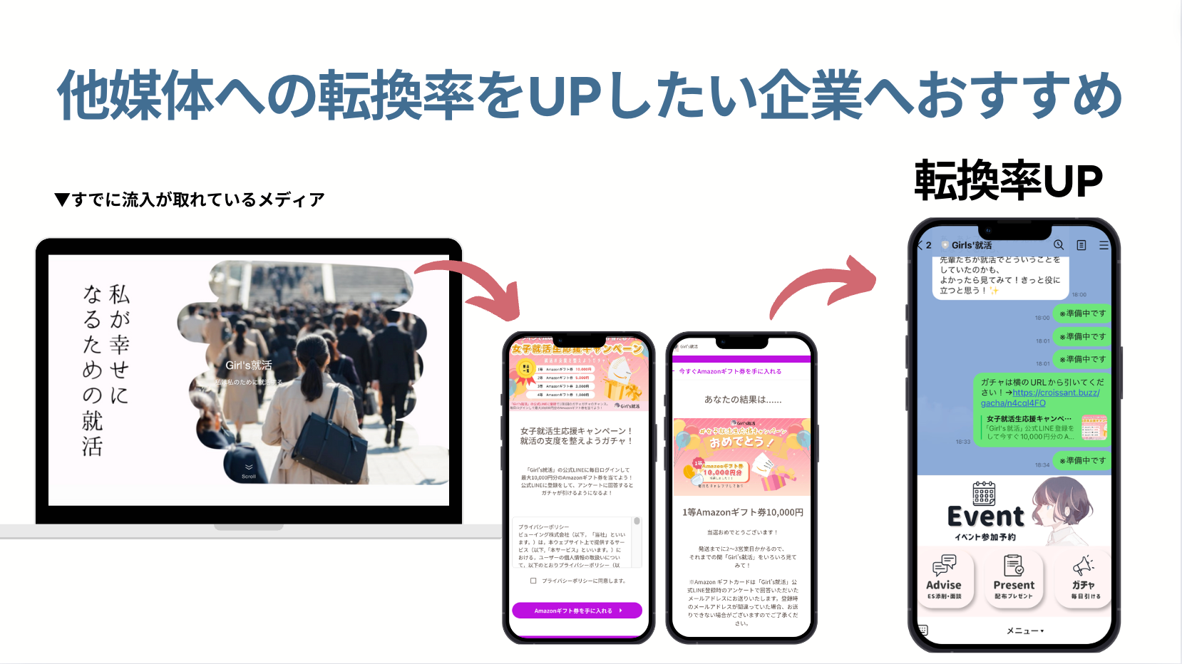 大野:現在、Girls'就活のLINE友達登録を増やしたいと思っていて、そのためにクロワッサンを活用しています。友達登録してもらいやすいように、インセンティブをつけたガチャを実施中です。