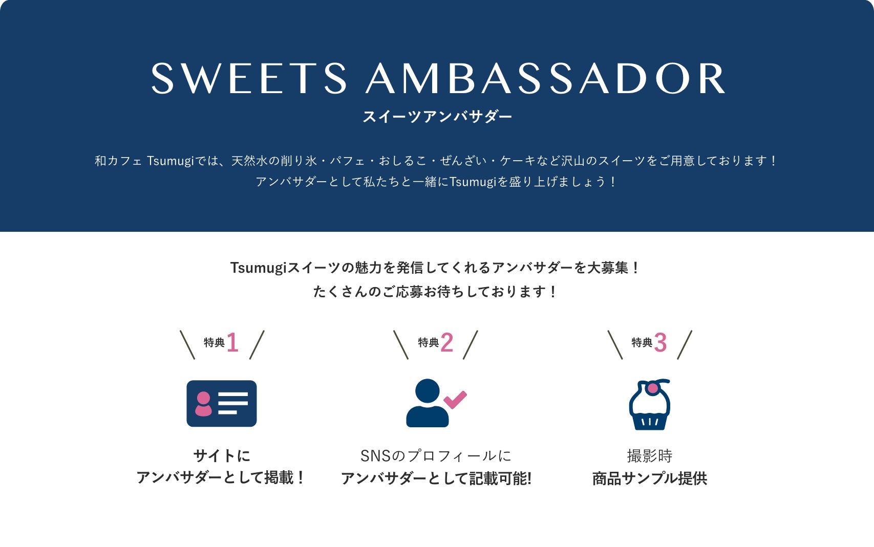 この度、和カフェ Tsumugiでは、Tsumugiを一緒に盛り上げてくださる「スイーツアンバサダー」を募集を開始いたしました。