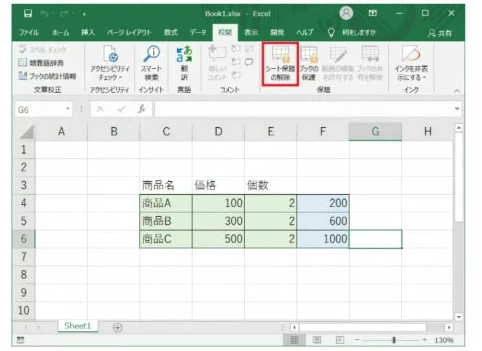 Step1:Excelファイルを開き、「校閲」―「シート保護の解除」をクリックします。
