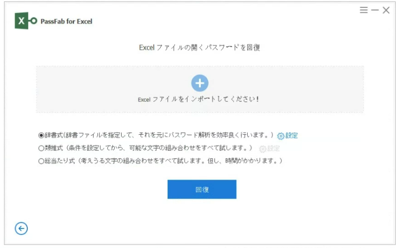Step2:画面をクリックして、パスワードを解除したいExcelファイルを追加します。パスワードについて覚えている情報や所要時間に応じて、お好みの解読方法を選択し、「回復」をクリックします。ソフトウェアがパスワードを解読すると、ポップアップでお知らせします。