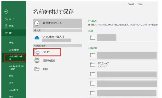 Step1:メニューから「ファイル」を選択し、「名前を付けて保存」―「その他の場所」―「このPC」をクリックします。