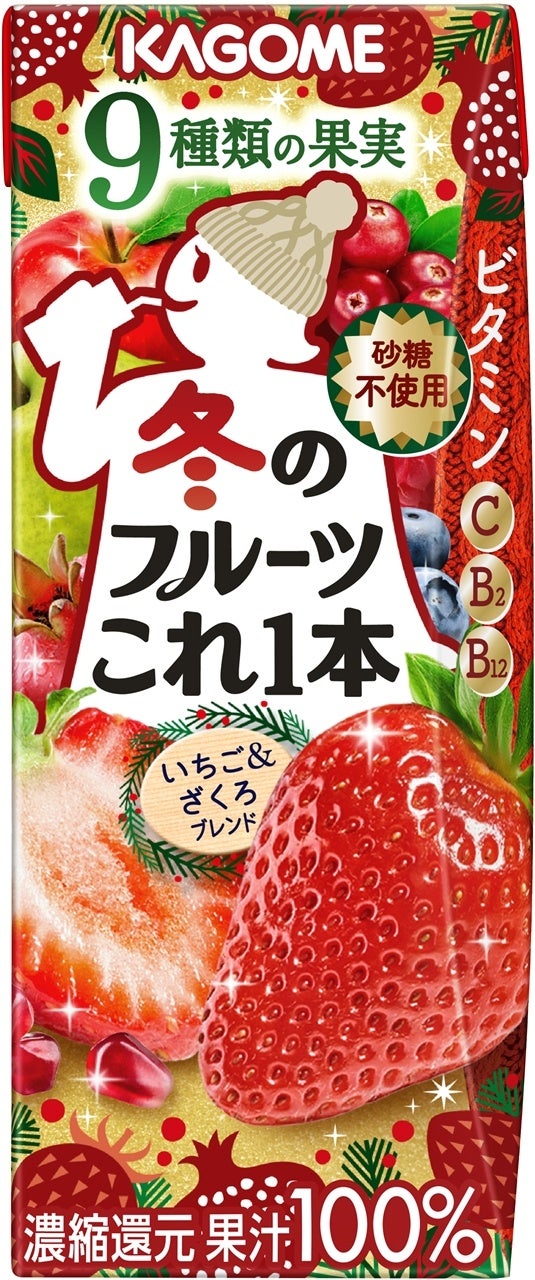 「冬のフルーツこれ一本 いちご&ざくろブレンド」は、いちごやザクロ等の9種類の果実をブレンドした冬限定の100%果実ミックスジュースです。冬にぴったりな贅沢な甘みある味わいをお楽しみいただけます。果実200g分使用※し、ビタミンC、B2,B12がたっぷり摂れます。朝食時やリフレッシュしたい時におすすめです。