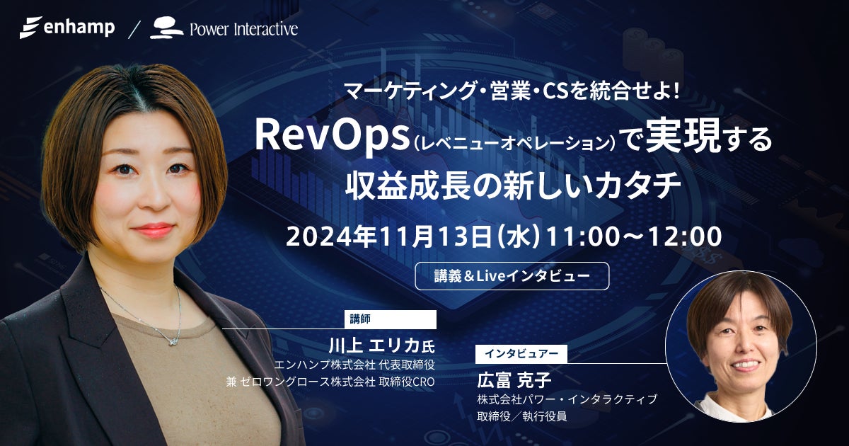 エンハンプ株式会社 代表取締役の川上エリカ氏をお招きし、9月25日に上梓された著書『RevOps(レベニューオペレーション)の教科書 部門間のデータ連携を図り収益を最大化する米国発の新常識』について、講演+Liveインタビュー形式で深堀りしていきます。