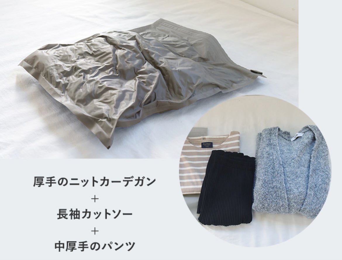 分厚い上着もペタンとコンパクトに圧縮でき、旅行バッグの中にスペースが生まれます。