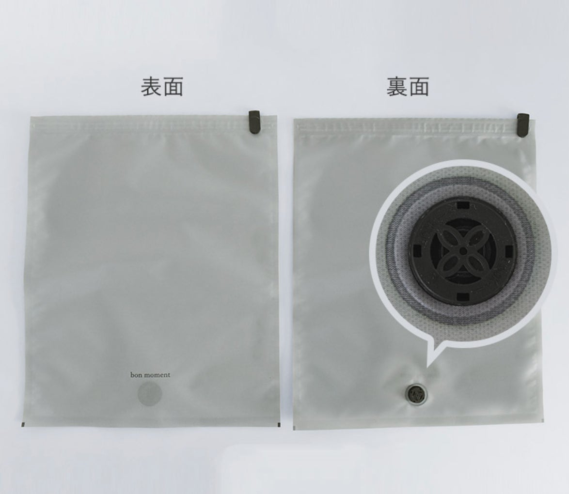 bon momentの衣類圧縮袋は、空気をスムーズに排出するバルブ付き。簡単スピーディに圧縮できるのがポイントです。