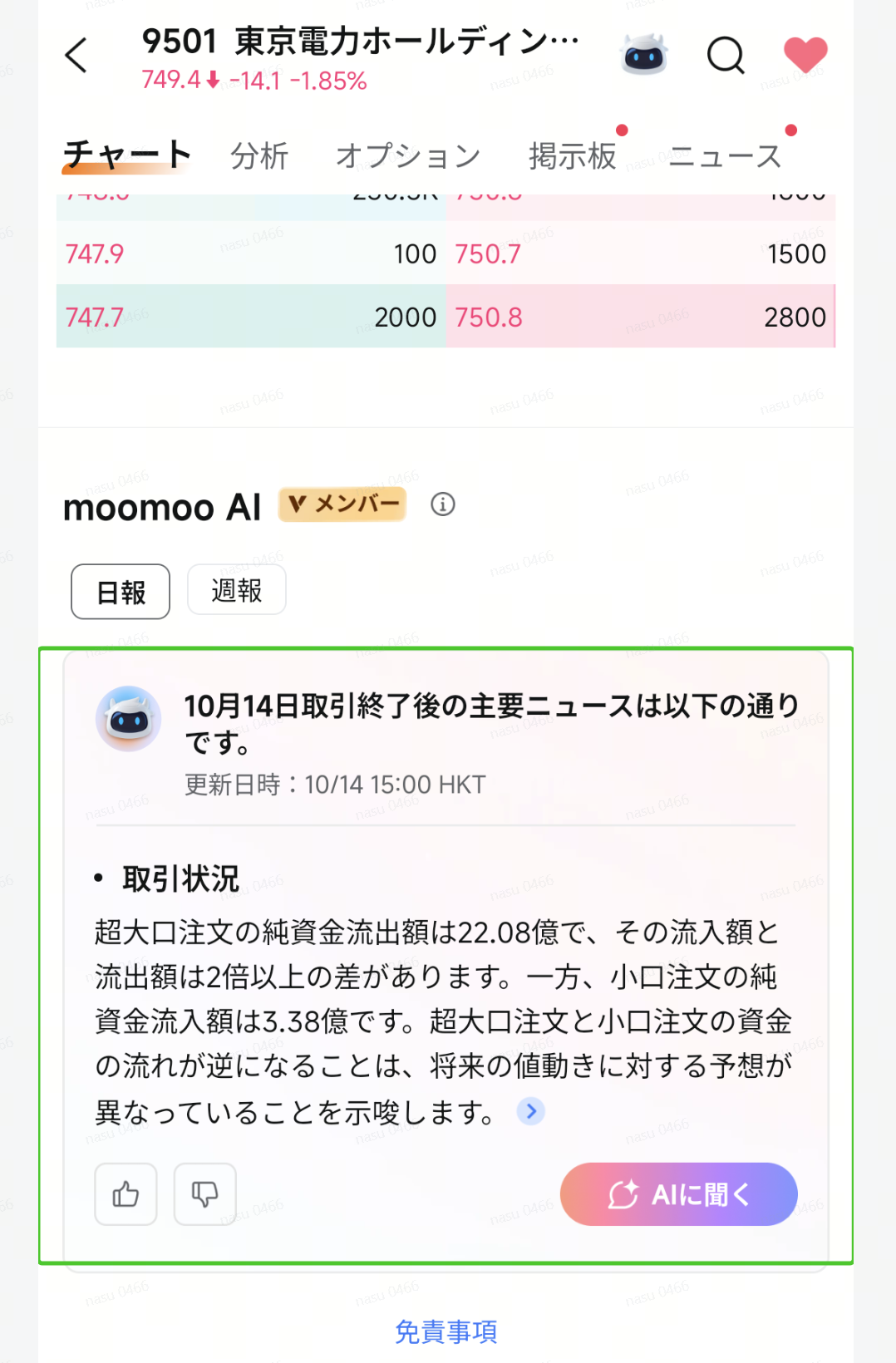 moomooアプリ> 銘柄情報ページ > チャート > 画面を下にスクロール > moomoo AI