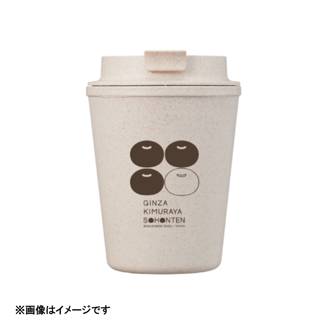 あんぱんをモチーフにしたデザインと、手提げ袋などにも使用される英字のデザインロゴがプリントされたタンブラーです。竹の繊維を樹脂に混合して作られたタンブラーで、プラスチックの使用量を削減する環境に優しい素材です。(ホットドリンクもお楽しみいただけます。)
