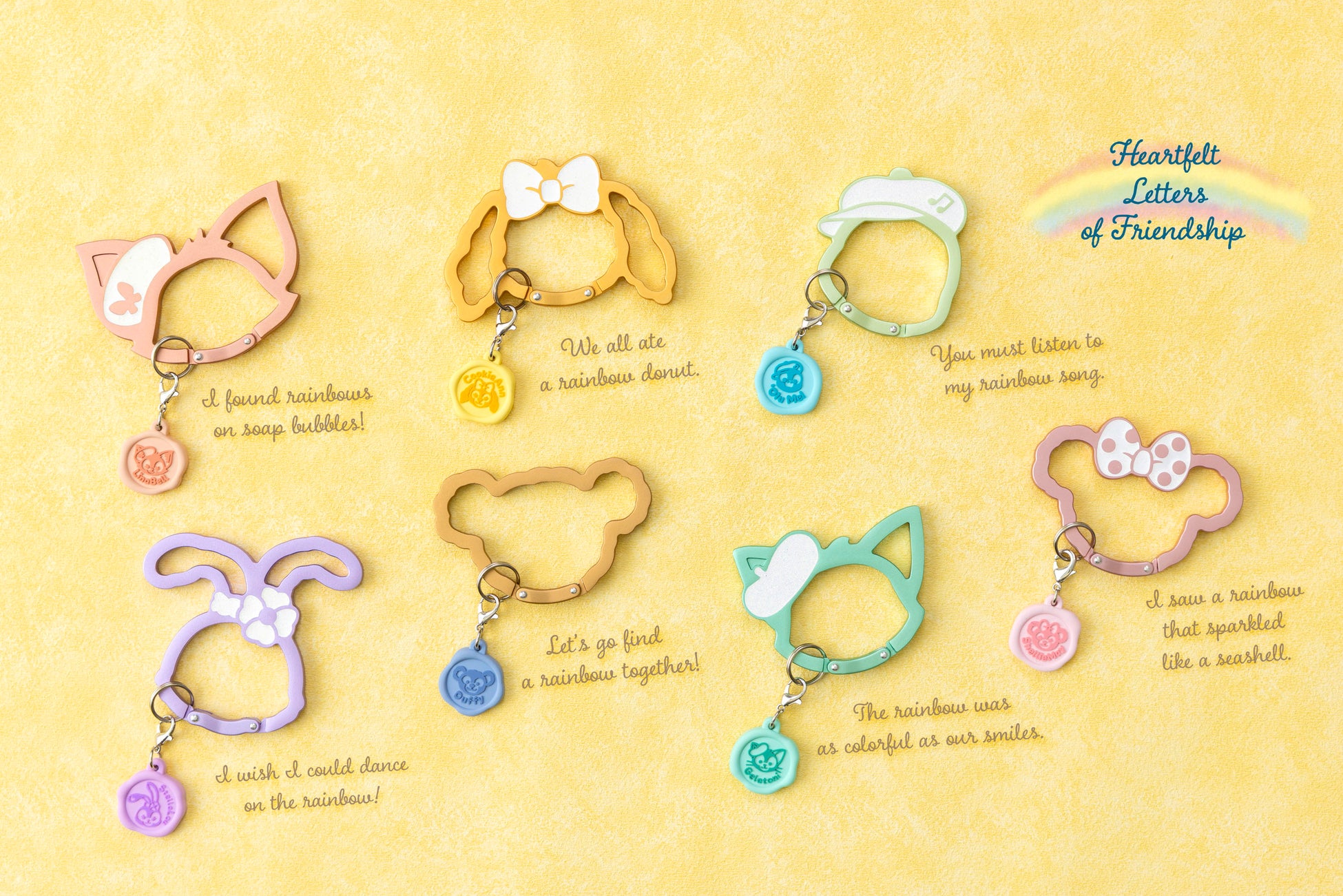 ぬいぐるみバッジは、ダッフィー&フレンズ7人が虹のようにさまざまな色合いのコスチュームを着ている「ダッフィー&フレンズのハートフェルト・レターズ・オブ・フレンドシップ」ならではのデザインです。また、ダッフィーのもこもこの耳と大きなリボンがついたベレー帽や、ミッキーへ書いた手紙からちょこんとダッフィーが顔をのぞかせているデザインのショルダーバッグ、大好きなミッキーにダッフィー&フレンズがあふれる思いを伝えている瞬間が大きく描かれたトートバッグや手紙を持っているくっつきぬいぐるみなどの身につけグッズが登場します。