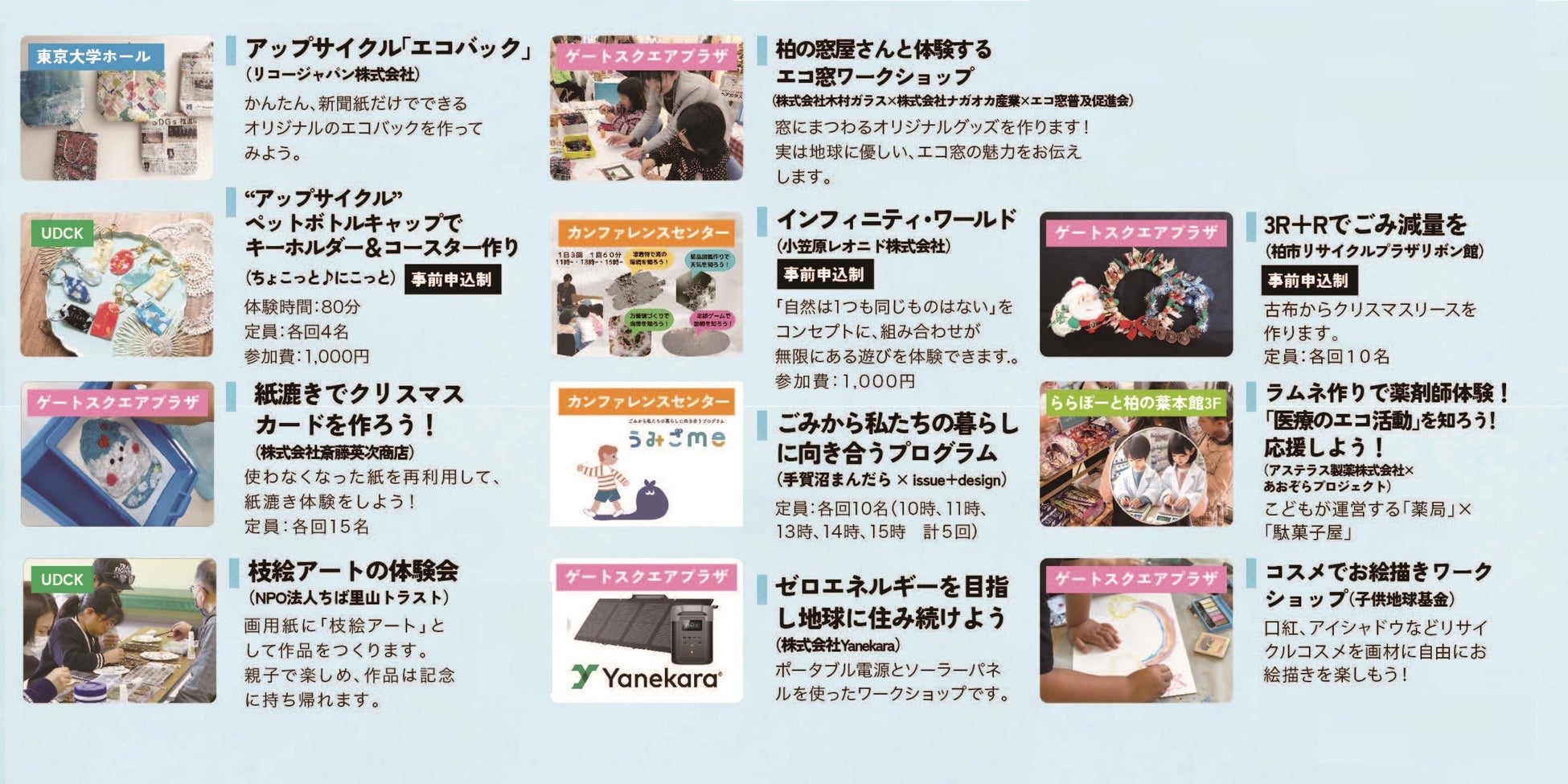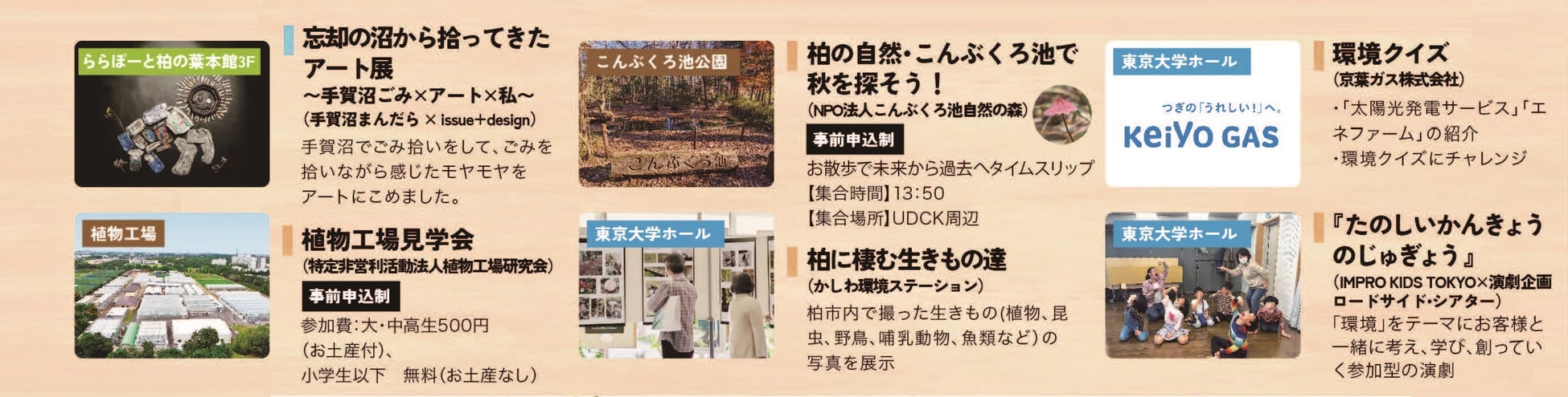 公・民・学連携で柏の葉地域のまちづくりを進めるUDCK(柏の葉アーバンデザインセンター)と柏市が連携し、環境をテーマとした普及啓発イベント「かしわ環境フェスタin柏の葉」を開催します。家族で楽しめるイベントもたくさんありますので、「聞く」「見る」「体験する」のプログラムから好きなものを選んで参加してみてください!
