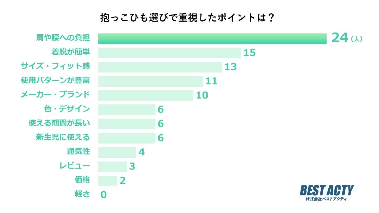 抱っこひも選びで重視したポイントについて100人にアンケートを行ったところ、「肩や腰への負担」と回答する人が最も多い結果となりました。
